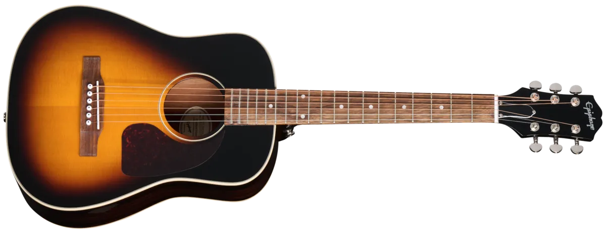 The J-45 Express from Epiphone is a cool new 7/8 size guitar that makes the perfect travel companion for seasoned guitarists and is also an excellent first guitar choice for aspiring new players. The shorter 22.68" scale length not only makes it compact and easy to take with you but also eases finger stretching for new players and makes learning how to play easier and more comfortable. It is made from quality materials, including a layered mahogany body, a mahogany neck with a laurel fretboard, and a layered spruce top. A gig bag is also included.