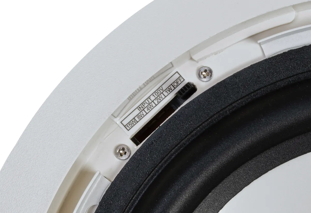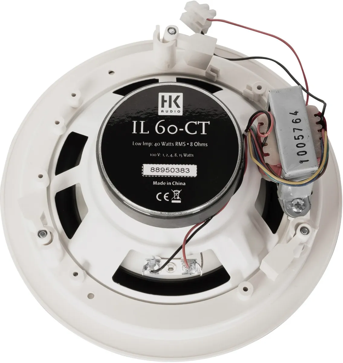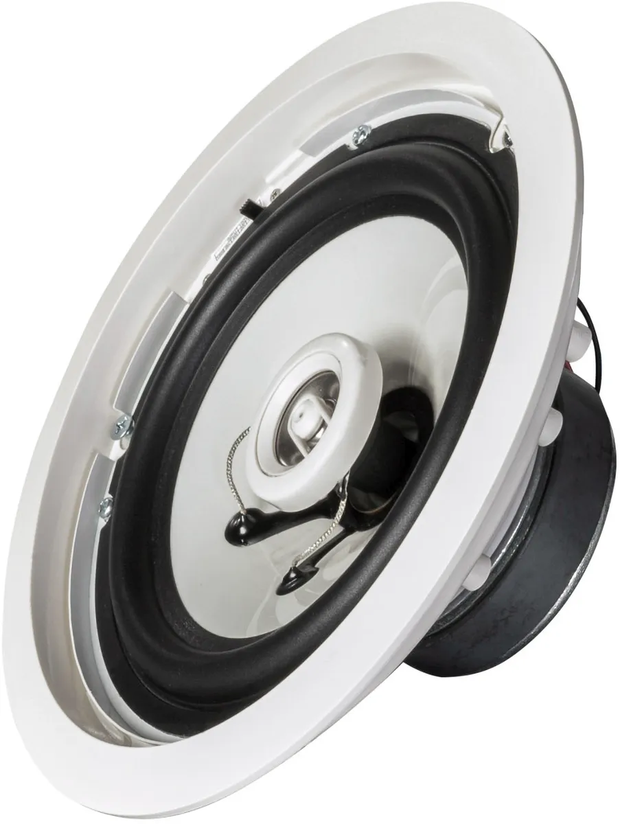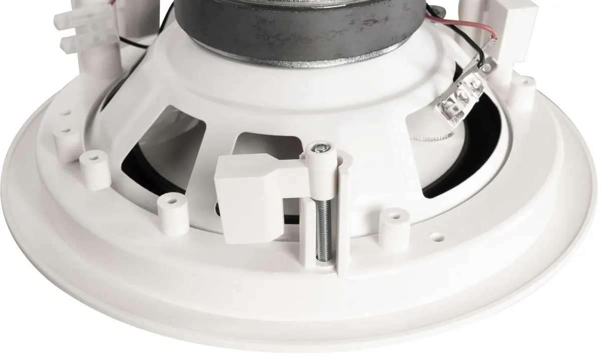 This compact two-way speaker installs into ceilings. It is well-suited for background and near-field sound reinforcement in foyers, boutiques, bars, restaurants, shopping centers, airports and railway stations. The enclosure is loaded with a 6.5″ woofer and a 1″ tweeter with neodymium magnets. Both drivers are aligned in coaxial array. The IL 60 CT features a built-in passive crossover and a 100V transformer with selectable power taps (accessible from below once the speaker installed). The front bezel is made of white polymer with a metal grille insert. It is installed using clamps that are accessible from below. This fullrange speaker”s frequency response is wide enough for use without a subwoofer.This compact two-way speaker installs into ceilings. It is well-suited for background and near-field sound reinforcement in foyers, boutiques, bars, restaurants, shopping centers, airports and railway stations. The enclosure is loaded with a 6.5″ woofer and a 1″ tweeter with neodymium magnets. Both drivers are aligned in coaxial array. The IL 60 CT features a built-in passive crossover and a 100V transformer with selectable power taps (accessible from below once the speaker installed).  The front bezel is made of white polymer with a metal grille insert. It is installed using clamps that are accessible from below. This fullrange speaker”s frequency response is wide enough for use without a subwoofer.