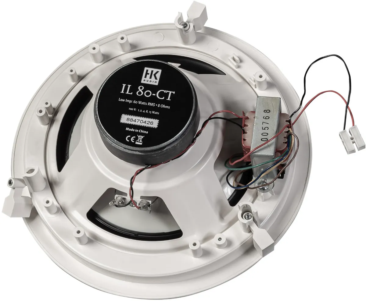 This two-way speaker installs into ceilings. It is well-suited for background and near-field sound reinforcement in foyers, boutiques, bars, restaurants, shopping centers, airports and railway stations. The enclosure is loaded with an 8″ woofer and a 1″ tweeter with neodymium magnets. Both drivers are aligned in coaxial array. The IL 80 CT features a built-in passive crossover and a 100V transformer with selectable power taps (accessible from below once the speaker installed). The front bezel is made of white polymer with a metal grille insert. It is installed using clamps that are accessible from below. This fullrange speaker”s frequency response is wide enough for use without a subwoofer.