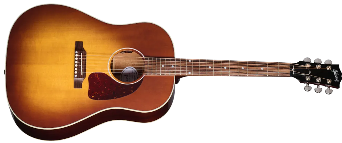 The J-45™ is Gibson's best-selling acoustic of all time. Nicknamed "The Workhorse" and first introduced in 1942, this iconic acoustic has become the cornerstone of its round-shoulder, dreadnought line. World-renowned for its full, balanced expression, warm bass, and excellent projection, the J-45 has been refined to carry this legacy to new heights. The Gibson J-45 Standard delivers a sound with incredible dynamic range, warm mids, and tight, punchy bass. Now available in Honey Burst VOS, it is equipped with an L.R. Baggs™ VTC under-saddle pickup and preamp system, making it stage and studio-ready from the moment you take it out of the included hardshell case.