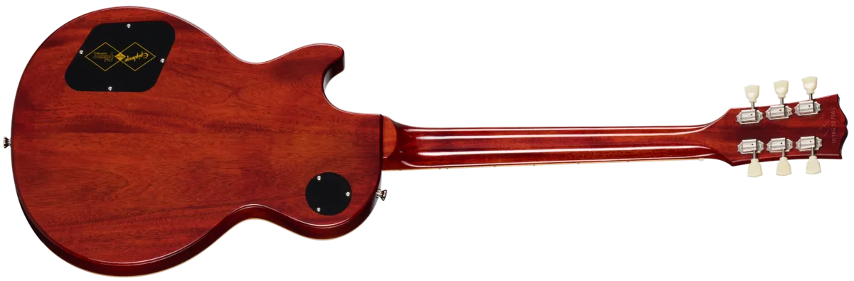 one-piece mahogany neck with a long neck tenon for increased stability and sustain, an authentic 1959 Rounded Medium C neck profile, and a bound rosewood fretboard. It also features mother-of-pearl trapezoid fretboard inlays, an aged mother-of-pearl Epiphone headstock logo, and the words "Les Paul Model" silkscreened in gold on the Gibson-style "open book" headstock. Even the side dot position markers are the same size as on vintage 1959 Les Paul Standard models and are placed in historically accurate locations. The genuine mahogany body features a carved maple cap that is topped with a beautiful AAA flamed maple veneer. The electronics are first class, with two USA Gibson Custombucker humbucking pickups with Alnico 3 magnets that are hand-wired to CTS® potentiometers, Bumblebee paper-in-oil capacitors, and a