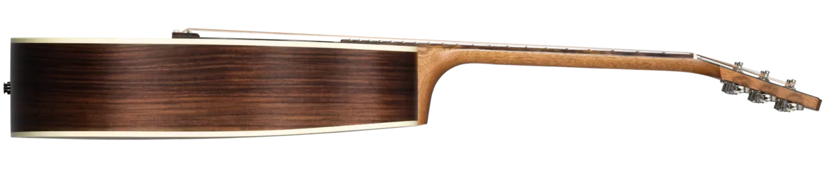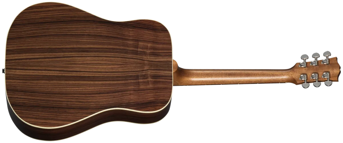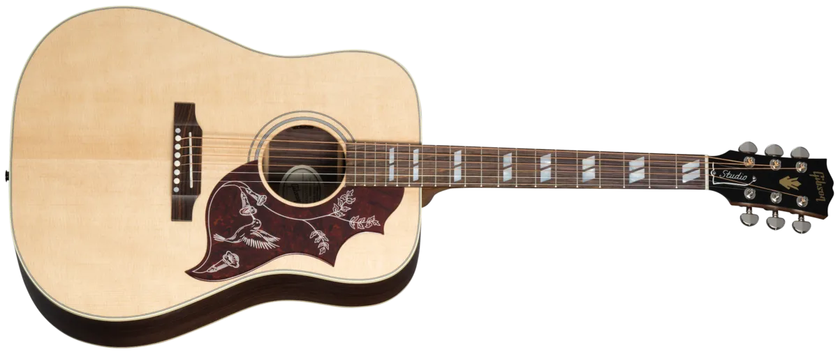 The Hummingbird™ Studio Rosewood continues Gibson's long history of producing world-famous square shoulder body designs, such as the Hummingbird, Dove™, and Songwriter models. The Hummingbird Studio Rosewood is handcrafted in Bozeman, Montana, using all-solid tonewoods, including a gloss nitrocellulose lacquer-finished Sitka spruce top for wide dynamic range, playing responsiveness, and balanced tone. The satin nitrocellulose lacquer-finished rosewood used for crafting the back and sides delivers a bit more rich-sounding bass and sparkling treble overtones than the traditional mahogany-bodied Hummingbird models. The Hummingbird Studio Rosewood's full-depth body ensures rich, deep tone and excellent volume and projection. The Hummingbird Studio Rosewood is equipped with an Advanced Response profile and satin nitrocellulose lacquer-finished utile neck for smooth, easy playability. The Advanced Response neck profile sits in between some of the other Gibson neck profiles and is not too large or too thin but sits "just right" in the hand for many players. The rosewood fretboard has 20 standard-sized frets and is adorned with the classic mother-of-pearl parallelogram inlays that are one of the visual hallmarks of the classic Hummingbird design. The fretboard's 16" radius makes playing fast passages easy and efficient, contributing further to the model's excellent playability. You'll find yourself reaching for this guitar again and again since playing it is so enjoyable. The headstock is equipped with smooth-turning Grover® Rotomatic® tuning machines and a Graph Tech® TUSQ® nut for excellent tuning stability SO you can spend more time playing and less time tuning. The saddle and bridge pins installed on the rosewood bridge plate are also TUSQ. The Hummingbird Studio's pickguard graphics deliver another classic Hummingbird visual touchstone. The Hummingbird Studio Rosewood has an L.R. Baggs™M Element Bronze active under-saddle piezo pickup with a quick-to-access soundhole-mounted volume control for easy studio-quality plug-and-play anywhere. Packaged in an included hardshell case for portability and protection, the Hummingbird Studio Rosewood is ready to join you wherever your muse takes you.