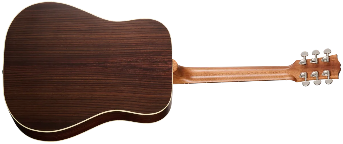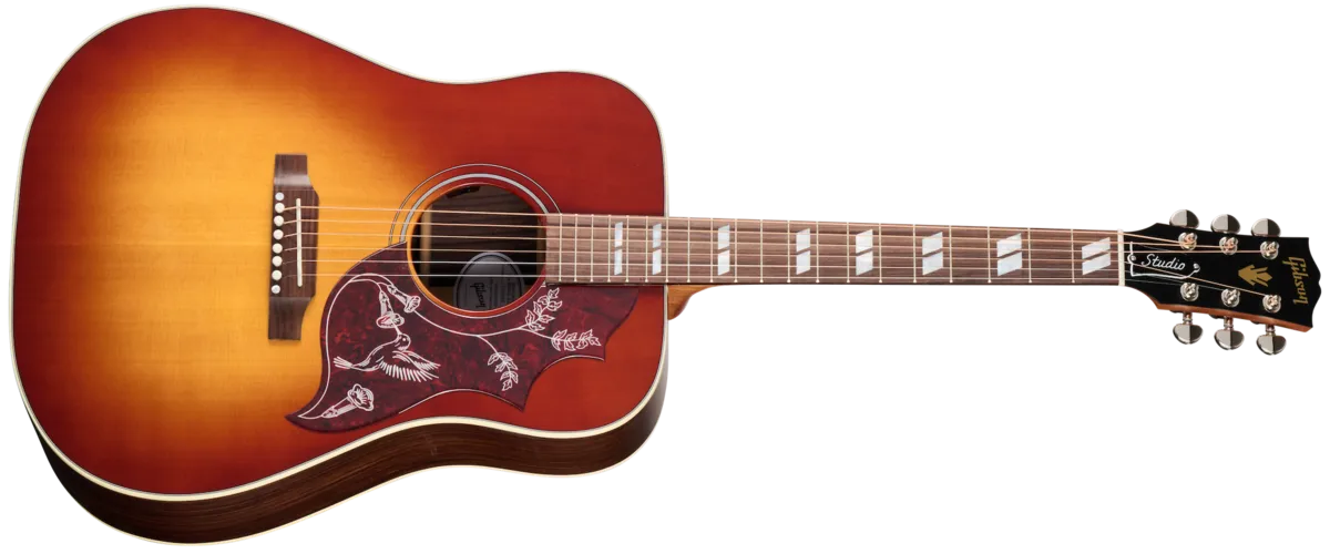 The Hummingbird™ Studio Rosewood continues Gibson's long history of producing world-famous square shoulder body designs, such as the Hummingbird, Dove™, and Songwriter models. The Hummingbird Studio Rosewood is handcrafted in Bozeman, Montana, using all-solid tonewoods, including a gloss nitrocellulose lacquer-finished Sitka spruce top for wide dynamic range, playing responsiveness, and balanced tone. The satin nitrocellulose lacquer-finished rosewood used for crafting the back and sides delivers a bit more rich-sounding bass and sparkling treble overtones than the traditional mahogany-bodied Hummingbird models. The Hummingbird Studio Rosewood's full-depth body ensures rich, deep tone and excellent volume and projection. The Hummingbird Studio Rosewood is equipped with an Advanced Response profile and satin nitrocellulose lacquer-finished utile neck for smooth, easy playability. The Advanced Response neck profile sits in between some of the other Gibson neck profiles and is not too large or too thin but sits "just right" in the hand for many players. The rosewood fretboard has 20 standard-sized frets and is adorned with the classic mother-of-pearl parallelogram inlays that are one of the visual hallmarks of the classic Hummingbird design. The fretboard's 16" radius makes playing fast passages easy and efficient, contributing further to the model's excellent playability. You'll find yourself reaching for this guitar again and again since playing it is so enjoyable. The headstock is equipped with smooth-turning Grover® Rotomatic® tuning machines and a Graph Tech® TUSQ® nut for excellent tuning stability SO you can spend more time playing and less time tuning. The saddle and bridge pins installed on the rosewood bridge plate are also TUSQ. The Hummingbird Studio's pickguard graphics deliver another classic Hummingbird visual touchstone. The Hummingbird Studio Rosewood has an L.R. Baggs™M Element Bronze active under-saddle piezo pickup with a quick-to-access soundhole-mounted volume control for easy studio-quality plug-and-play anywhere. Packaged in an included hardshell case for portability and protection, the Hummingbird Studio Rosewood is ready to join you wherever your muse takes you.
