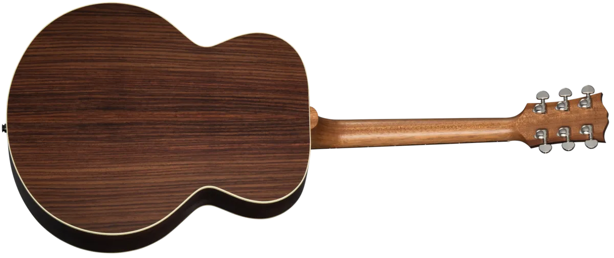 The Gibson SJ-200 ™ was first introduced in 1937 as the Super Jumbo. With its Super Jumbo body size and excellent projection, the SJ-200 still makes an undeniable statement like no other acoustic guitar. From country to folk, Americana to rock 'n' roll, countless musical icons have picked the SJ-200 to make some of the world's most beloved music. Now, Gibson is proud to introduce the updated SJ-200 Studio Rosewood. The SJ-200 Studio Rosewood is handcrafted in Bozeman, Montana, using all-solid tonewoods, including a gloss nitrocellulose lacquer-finished Sitka spruce top for wide dynamic range, playing responsiveness, and balanced tone. The satin nitrocellulose lacquer-finished rosewood used for crafting the back and sides delivers more rich-sounding bass than the more commonly seen maple-bodied SJ-200 models, just like some of the rare rosewood-backed vintage SJ-200 models from the pre-war era. The SJ-200 Studio Rosewood's full-depth body ensures rich, deep tone and outstanding volume and projection for which this model is famous. The SJ-200 Studio Rosewood is equipped with an Advanced Response profile and satin nitrocellulose lacquer-finished utile neck for smooth, easy playability. The Advanced Response neck profile sits in between some of the other Gibson neck profiles and is not too large or too thin but fits "just right" in the hand for many players. The rosewood fretboard has 20 standard-sized frets and is adorned with the classic mother-of-pearl graduated crown inlays, one of the visual hallmarks of the classic SJ-200 design. The fretboard's 16" radius makes playing fast passages easy and efficient, contributing further to the model's excellent playability. You'll find yourself reaching for this guitar again and again since playing it is so enjoyable. The headstock is equipped with smooth-turning Grover® Rotomatic® tuning machines and a Graph Tech® TUSQ® nut for excellent tuning stability SO you can spend more time playing and less time tuning. The saddle and bridge pins installed on the rosewood bridge plate are also TUSQ. The SJ-200 Studio Rosewood has an L.R. Baggs™ Element Bronze active under-saddle piezo pickup with a quick-to-access soundhole-mounted volume control for easy studio-quality plug-and-play anywhere. Packaged in a modern hardshell case for portability and protection, the SJ-200 Studio Rosewood is ready to join you wherever your music takes vou.