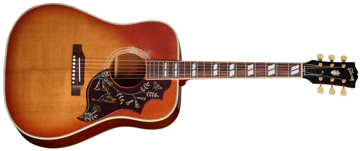 Introduced in 1960 as Gibson's first square-shoulder acoustic guitar, the Hummingbird™ arrived at the dawn of a new era in music and was rapidly embraced by the prime movers on the scene. Built with a thermally aged Sitka spruce top, the 1960 Hummingbird Heavy Aged reflects the appearance and performance of those early icons. Featuring a mahogany neck with an Indian rosewood fretboard, a fixed bone bridge, bone nut, and bone bridge pins, the famous casted Hummingbird pickguard, and gold Gotoh® tuners with Keystone buttons, it's been masterfully aged by the artisans of the Murphy Lab to give it the look and feel of a long-cherished musical companion.
