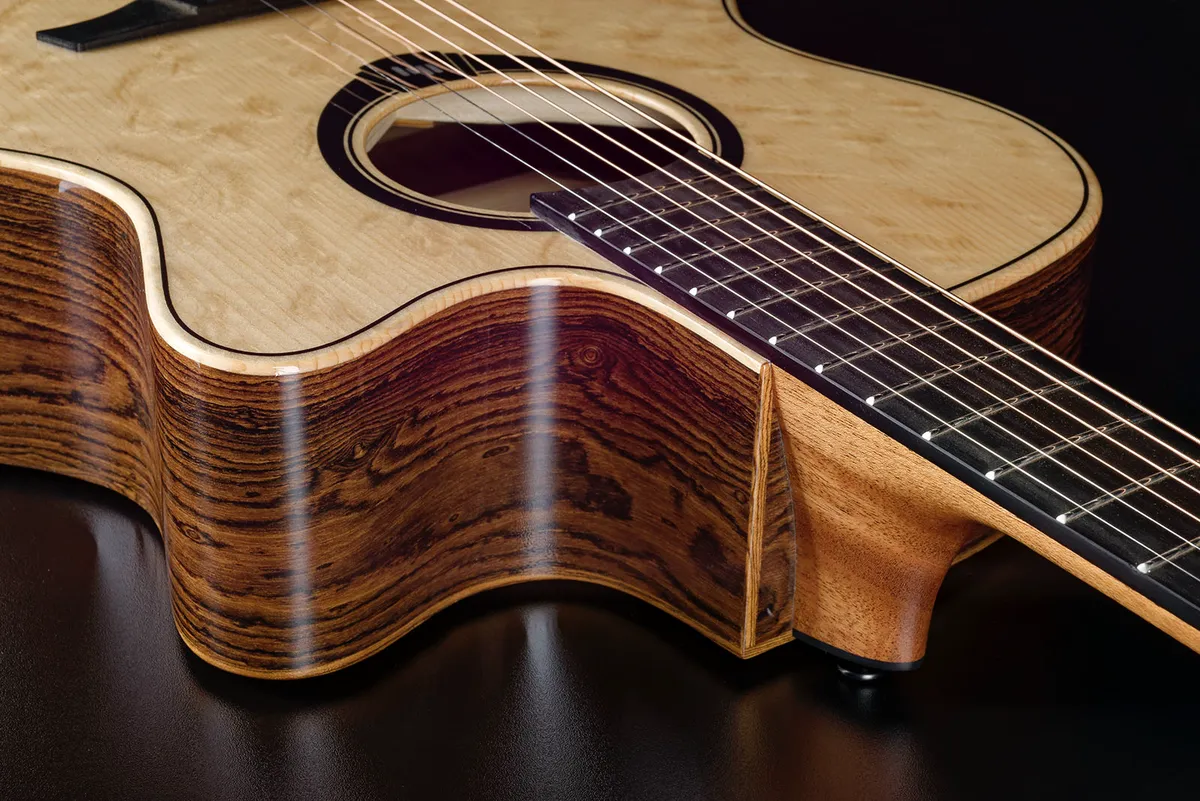 Figured Bocote (Mexican Rosewood) back and sides provide depth to the sound and stunning visual details. With its cutaway design for easy access to higher frets, and a Black Brankowood fingerboard