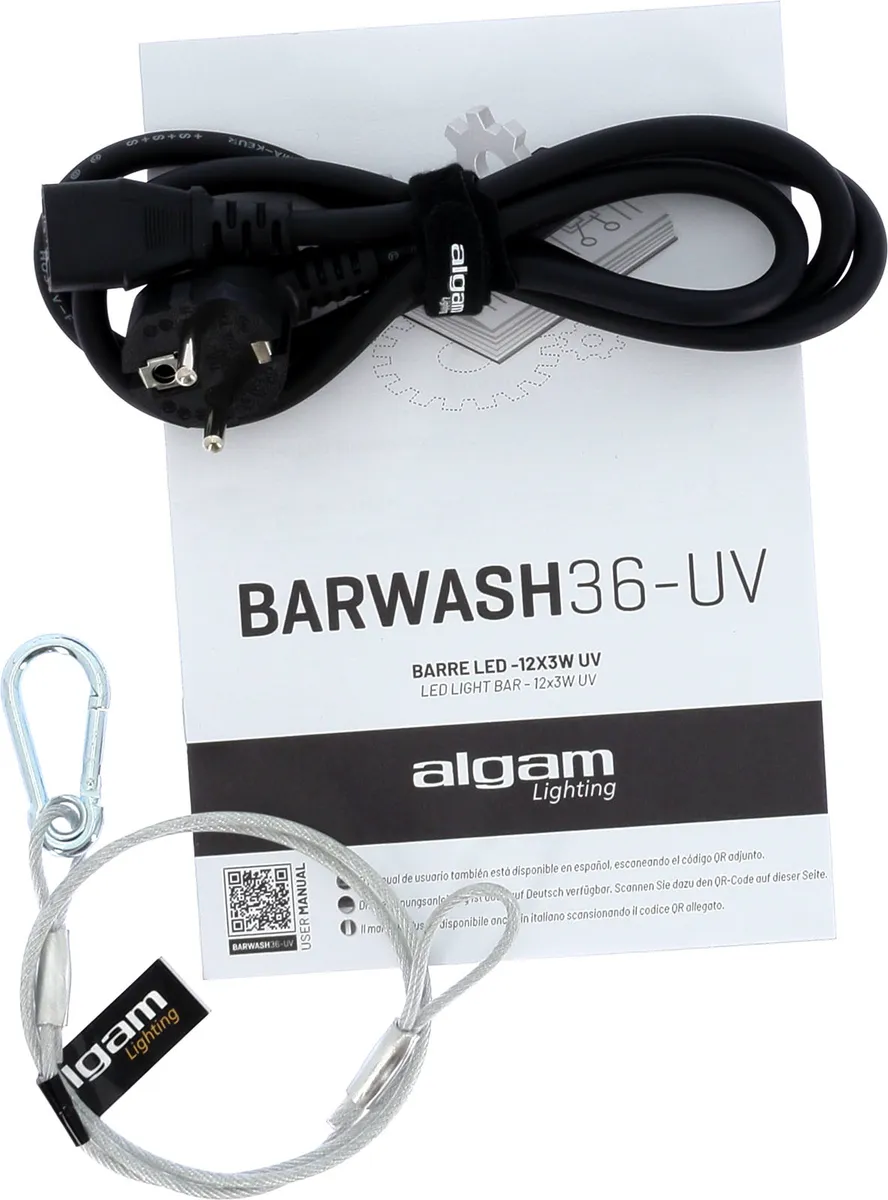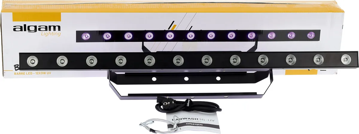 A compact and powerful UV barThe BARWASH36 UV from Algam Lighting is a professional 1-meter LED bar designed exclusively for ultraviolet lighting. Equipped with 12 3W UV LEDs (36W total) and a 40° beam angle, it delivers uniform wash lighting ideal for revealing fluorescent paints, textiles, and makeup. Lightweight (2.8 kg), robust, and compact (1000 × 51 × 157 mm), it fits easily into any stage or event configuration. Its simplified control via DMX-512 (1 channel) or manual mode ensures quick implementation and compatibility with most installations.Immersive atmospheres for a variety of applicationsThe Barwash 36 UV is ideal for a wide range of settings: clubs, theme bars, and festivals to energize the dance floor; concerts and shows to accentuate visual effects; galleries and exhibitions to reveal creations invisible in natural light; and immersive events and escape games to create unique atmospheres. Thanks to its serial power inputs and outputs, it allows for the smooth deployment of multiple units, providing uniform UV coverage that is suitable for both temporary installations and fixed equipment.