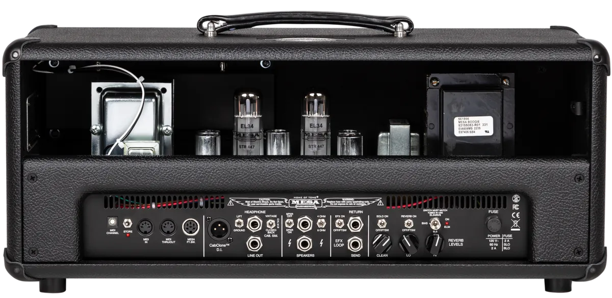 Power Amp Tubes: 2x Mesa EL-34 (or 6V6 or 6L6) Preamp Tubes: 6x Mesa 12AX7, 1x Mesa 12AT7 Rectifier Type: Silicon Diodes Reverb Effects Bypass Footswitchable, All-Tube, Short-Tank Spring Reverb with Options: Independent Channel Controls (rear panel)