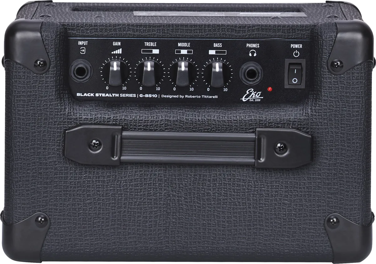 A super compact format!The G-BS10 was developed by Eko, in partnership with technician Roberto Tittarelli, to offer guitarists a small, lightweight, and compact transistor combo for practicing electric guitar. This combo delivers 10W through a 8inch speaker and allows you to explore a variety of sounds and musical styles thanks to its two channels (clean and drive) selectable via a switch, for clear or more saturated sounds.Simple but effective!The G-BS10 features a simple but effective interface: a gain control, complemented by a classic three-band EQ, and a volume control to manage the two channels. In addition to the guitar input, this small amplifier includes an auxiliary input for playing along with your favorite songs, as well as a headphone output for discreet practice when needed.Compact and lightweight at 4.8 kg, the G-BS10 is an ideal guitar combo for beginner guitarists looking for an amplifier for home use or small rehearsals, at a very reasonable price.