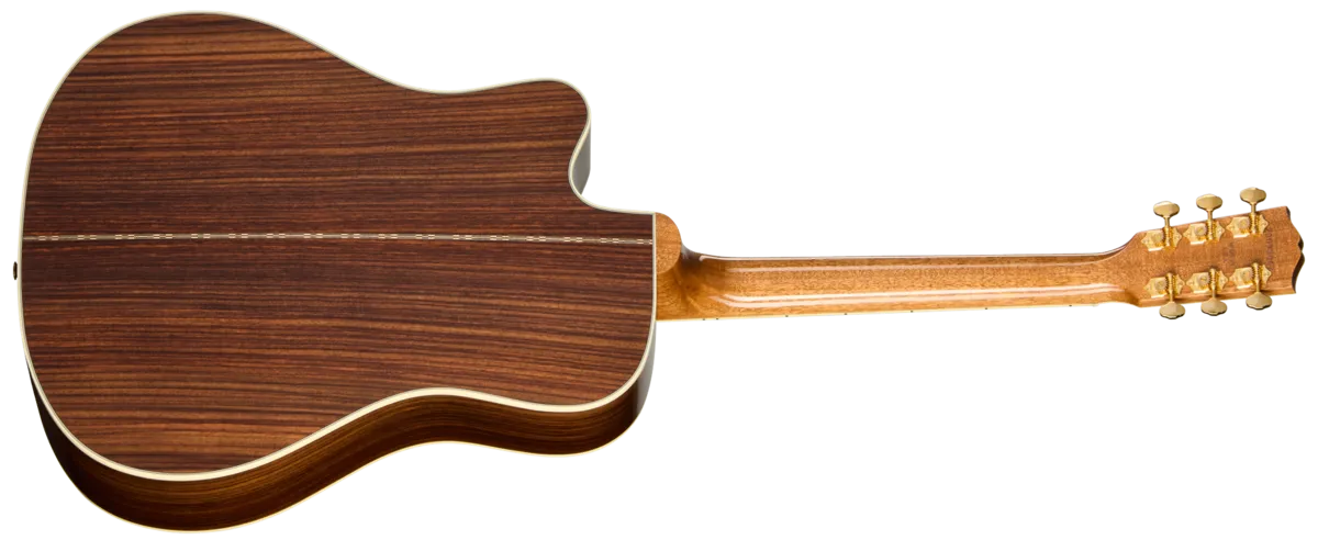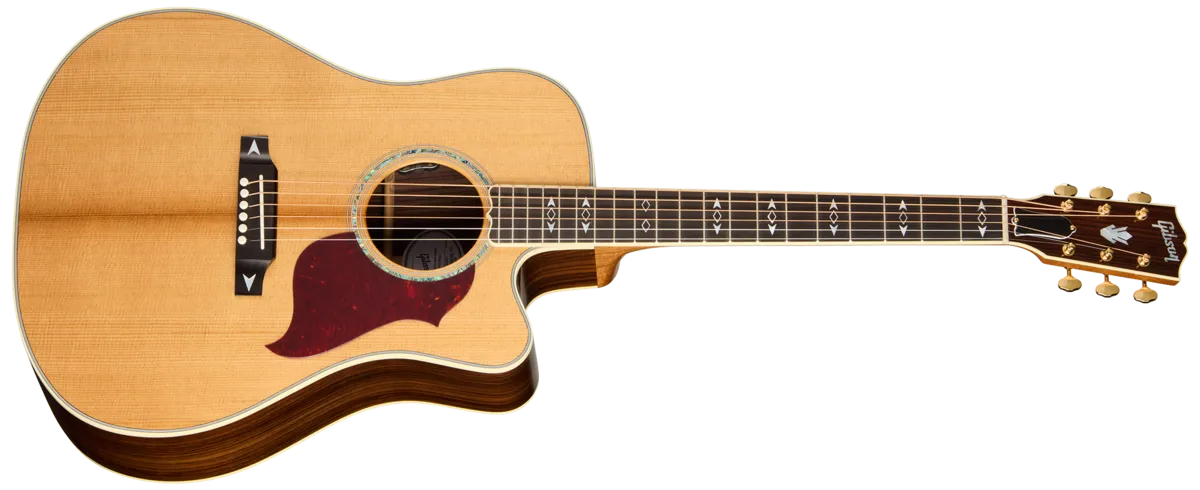 The Gibson Songwriter was introduced in the late 1990s and features a unique Gibson square shoulder modern dreadnought body design. The Songwriter Recording Artist EC captures the historic tonal advantages that come from Gibson's famed 1930s scalloped Advanced X-braced top, 25.5" long scale length, and tonewoods that are similar to the 1936 Advanced Jumbo's, for a unique sound that is still 100% Gibson. Created for the connoisseur of acoustic recording and live performance, the Songwriter Recording Artist EC is a superior, powerful, and dynamic guitar for the most demanding professional players.The Songwriter Recording Artist EC is handcrafted in Bozeman, Montana, using a thermally aged Sitka spruce top that is paired with a cutaway body crafted with rosewood back and sides. The cutaway body of the Songwriter Recording Artist EC provides enhanced access to the upper frets, making it ideal for lead guitarists and others who seek expanded range from their acoustic guitar. The 25.5" scale mahogany neck has a comfortable Round profile, and is fitted with a smooth-playing, bound ebony fretboard that is equipped with 20 standard frets and adorned with mother-of-pearl diamond eye inlays. The neck has a compound dovetail joint and is attached to the body using hot hide glue for a stable connection and maximum tonal transfer. The bound headstock has a rosewood veneer that features the Gibson logo and Crown inlaid in mother-of-pearl. The nut is bone, and high-quality gold Grover® open-back tuners are fitted. The bridge is also ebony and is equipped with a bone saddle and TUSQ® bridge pins, and decorated with mother-of-pearl arrow inlays. The thermally-aged Sitka spruce top is protected by a custom line tortoise pickguard and features a wide abalone rosette.As the name implies, the Songwriter Recording Artist EC was designed to be a great recording and live performance guitar, and comes with high-quality electronics for easy plug-and-play performance in the studio or on stage. The built-in L.R. Baggs ™ HiFi system features dual bridge plate sensors and a preamp inside the guitar that deliver outstanding dynamics, string balance, and note definition, while also being feedback resistant. The preamp is voiced to work together with the sensors to deliver natural-sounding acoustic tone when plugged in. The system's soundhole-mounted volume and tone controls are easily accessed by the player while remaining all but invisible to the audience. The Songwriter Recording Artist EC ships in a Gibson hardshell case for protection when you're on the road, and is a great choice for modern acoustic guitarists who perform live and in the studio. Try one for yourself, and prepare to be amazed.