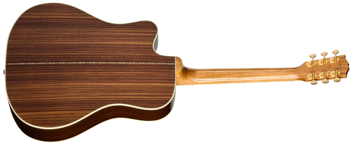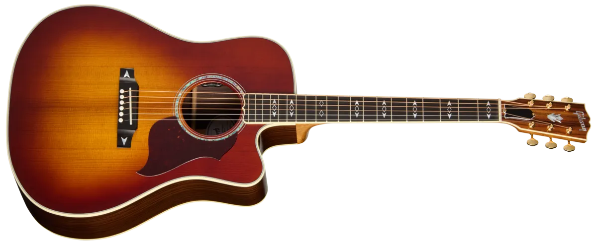 The Gibson Songwriter was introduced in the late 1990s and features a unique Gibson square shoulder modern dreadnought body design. The Songwriter Recording Artist EC captures the historic tonal advantages that come from Gibson's famed 1930s scalloped Advanced X-braced top, 25.5" long scale length, and tonewoods that are similar to the 1936 Advanced Jumbo's, for a unique sound that is still 100% Gibson. Created for the connoisseur of acoustic recording and live performance, the Songwriter Recording Artist EC is a superior, powerful, and dynamic guitar for the most demanding professional players.The Songwriter Recording Artist EC is handcrafted in Bozeman, Montana, using a thermally aged Sitka spruce top that is paired with a cutaway body crafted with rosewood back and sides. The cutaway body of the Songwriter Recording Artist EC provides enhanced access to the upper frets, making it ideal for lead guitarists and others who seek expanded range from their acoustic guitar. The 25.5" scale mahogany neck has a comfortable Round profile, and is fitted with a smooth-playing, bound ebony fretboard that is equipped with 20 standard frets and adorned with mother-of-pearl diamond eye inlays. The neck has a compound dovetail joint and is attached to the body using hot hide glue for a stable connection and maximum tonal transfer. The bound headstock has a rosewood veneer that features the Gibson logo and Crown inlaid in mother-of-pearl. The nut is bone, and high-quality gold Grover® open-back tuners are fitted. The bridge is also ebony and is equipped with a bone saddle and TUSQ® bridge pins, and decorated with mother-of-pearl arrow inlays. The thermally-aged Sitka spruce top is protected by a custom line tortoise pickguard and features a wide abalone rosette.As the name implies, the Songwriter Recording Artist EC was designed to be a great recording and live performance guitar, and comes with high-quality electronics for easy plug-and-play performance in the studio or on stage. The built-in L.R. Baggs™ HiFi system features dual bridge plate sensors and a preamp inside the guitar that deliver outstanding dynamics, string balance, and note definition, while also being feedback resistant. The preamp is voiced to work together with the sensors to deliver natural-sounding acoustic tone when plugged in. The system's soundhole-mounted volume and tone controls are easily accessed by the player while remaining all but invisible to the audience. The Songwriter Recording Artist EC ships in a Gibson hardshell case for protection when you're on the road, and is a great choice for modern acoustic guitarists who perform live and in the studio. Try one for yourself, and prepare to be amazed.