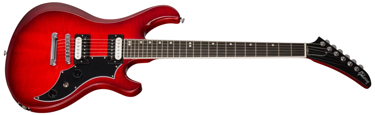 The new Gibson Victory Figured Top answers the call from musicians who have long wanted this cult classic from the 1980s to return, and since its reintroduction, it has quickly become a standout favorite. Designed to inspire limitless creativity, it preserves the character of the original models while introducing thoughtful refinements, including sleeker body shaping, improved weight distribution for greater comfort, and an Explorer™ style headstock featuring a Graph Tech® nut and Grover® Mini Rotomatic® tuners to ensure rock-solid tuning stability. Its 25.5" scale length makes it a natural fit for lower tunings, and the mahogany neck is paired with an ebony fretboard with a compound radius for smooth playability, a fast SlimTaper profile, and 24 medium jumbo frets that extend the instrument's range. The double cut mahogany body is topped with a striking AA figured maple cap that adds extra clarity and top-end presence to the warmth of the mahogany, complemented by a Tune O Matic™ bridge with a Stop Bar tailpiece and a gloss nitrocellulose lacquer finish.Its versatile electronics include a pair of 80s Tribute humbucker™ pickups connected to push/pull master volume and tone controls for coil splitting and inner or outer coil selection when split, providing an expansive palette of humbucking and single coil voices with minimal controls and maximum flexibility. A Gibson hardshell case is included with every Victory Figured Top, offering dependable protection on the road. Blending the best attributes of the original 80s models with modern enhancements, the Victory Figured Top is perfectly suited for contemporary players. There has never been a better moment to experience Victory for yourself — order yours today, and play to win.