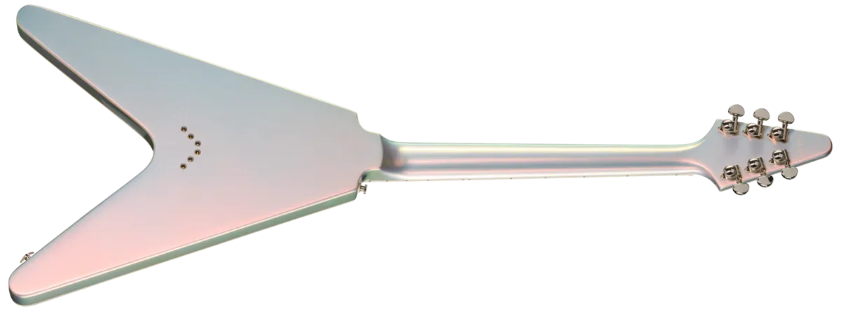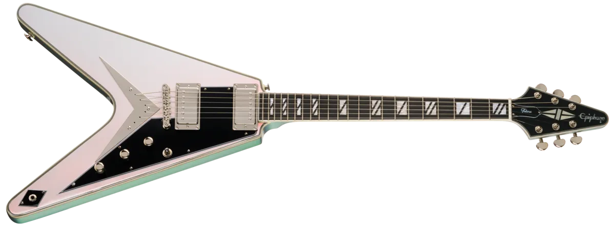 The new Futura Series guitars from Epiphone are designed for today's guitarists who want a guitar that delivers professional performance and forward-thinking features. These Inspired by Gibson models deliver tone and style that's perfect for gigging, recording, or content creation in the modern era. With bold, color-shifting finishes, all-new pickups, and versatile electronic features like coil splitting and phase switching, they have the look and sound that today's players need to stand out from the crowd and make their own statement, both sonically and visually. Other high-performance features, including stainless steel frets, compound-radius fretboards, and ultra-comfortable neck profiles, make the Futura Series guitars truly innovative and a must-have addition for any guitar collection.The Gibson Flying V™ remains one of the most iconic and adventurous designs in electric guitar history. First introduced in the late 1950s, its futuristic shape was ahead of its time, eventually becoming a favorite among rock and metal players worldwide. Epiphone proudly introduces the Futura Flying V Custom-a striking, modern interpretation of that groundbreaking design. Its angular mahogany body features elegant 7-ply top binding, paired with a LockTone T™ Tune-O-Matic™ bridge and LockTone Stop Bar tailpiece for exceptional sustain and tuning stability. Posi-Lok™ strap buttons keep your strap secure without extra hardware. The glued-in mahogany neck sports a sleek Modern C profile for effortless playability, topped with a bound ebony fingerboard featuring 22 stainless steel medium jumbo frets and sophisticated Super 400-style pearloid split block inlays. A 10"-14" compound radius ensures smooth chording and bends, while the bound arrowhead-shaped headstock includes locking Grover® Rotomatic® tuners with kidney buttons, a Graph Tech® nut, and elegant mother-of-pearl inlays for the Custom split diamond and Epiphone logo.At the heart of the Futura Flying V Custom are Epiphone's new ProBucker™ Ignite humbuckers™ delivering powerful tones with clarity and definition. Two push/pull volume controls enable coil-splitting, while a push/pull tone control adds phase switching for even greater sonic flexibility. Available in two stunning Chromashift finishes-Quicksilver Shift and Solaris Shift-this guitar is designed to turn heads on stage or on screen. Whether you're after a modern aesthetic, versatile electronics, or a performance-ready instrument, the Futura Flying V Custom delivers. Each one ships with a premium gig bag, ready to accompany you wherever inspiration strikes.