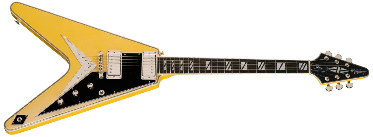 The new Futura Series guitars from Epiphone are designed for today's guitarists who want a guitar that delivers professional performance and forward-thinking features. These Inspired by Gibson models deliver tone and style that's perfect for gigging, recording, or content creation in the modern era. With bold, color-shifting finishes, all-new pickups, and versatile electronic features like coil splitting and phase switching, they have the look and sound that today's players need to stand out from the crowd and make their own statement, both sonically and visually. Other high-performance features, including stainless steel frets, compound-radius fretboards, and ultra-comfortable neck profiles, make the Futura Series guitars truly innovative and a must-have addition for any guitar collection.The Gibson Flying V™ remains one of the most iconic and adventurous designs in electric guitar history. First introduced in the late 1950s, its futuristic shape was ahead of its time, eventually becoming a favorite among rock and metal players worldwide. Epiphone proudly introduces the Futura Flying V Custom-a striking, modern interpretation of that groundbreaking design. Its angular mahogany body features elegant 7-ply top binding, paired with a Lock Tone ™ Tune-O-Matic™ bridge and LockTone Stop Bar tailpiece for exceptional sustain and tuning stability. Posi-Lok™ strap buttons keep your strap secure without extra hardware. The glued-in mahogany neck sports a sleek Modern C profile for effortless playability, topped with a bound ebony fingerboard featuring 22 stainless steel medium jumbo frets and sophisticated Super 400-style pearloid split block inlays. A 10"-14" compound radius ensures smooth chording and bends, while the bound arrowhead-shaped headstock includes locking Grover® Rotomatic® tuners with kidney buttons, a Graph Tech® nut, and elegant mother-of-pearl inlays for the Custom split diamond and Epiphone logo.At the heart of the Futura Flying V Custom are Epiphone's new ProBucker™ Ignite humbuckers T™, delivering powerful tones with clarity and definition. Two push/pull volume controls enable coil-splitting, while a push/pull tone control adds phase switching for even greater sonic flexibility. Available in two stunning Chromashift finishes-Quicksilver Shift and Solaris Shift-this guitar is designed to turn heads on stage or on screen. Whether you're after a modern aesthetic, versatile electronics, or a performance-ready instrument, the Futura Flying V Custom delivers. Each one ships with a premium gig bag, ready to accompany you wherever inspiration strikes.