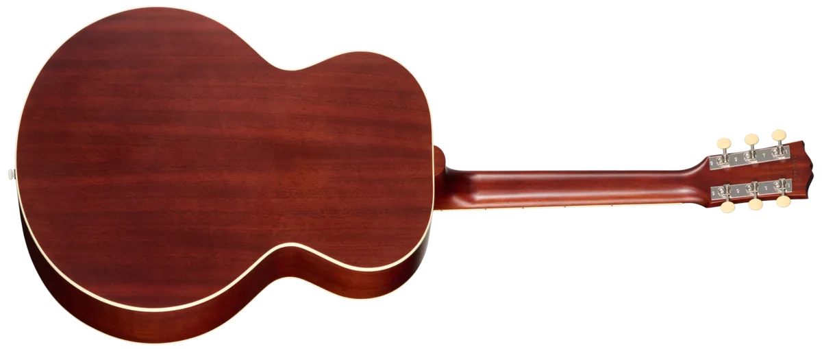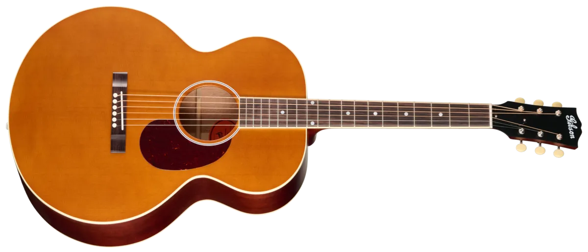 While the Gibson J-185 may not have achieved the same universal name recognition as models like the J-45 TM 1, SJ-200 TM ', and Hummingbird T™ ', it has long held a special place among knowledgeable players, who consider it one of the best-sounding acoustic guitars Gibson has ever made. Originally released in 1951, the J-185's body outline drew inspiration from the celebrated 1920s L-5 models, sharing much of their silhouette and proportions. Slightly more compact than an SJ-200 and built with the familiar 24.75" scale length also found on the J-45 and Hummingbird, the J-185 carved out a tonal identity that has made it a favorite for decades.Gibson now introduces a fresh interpretation of this beloved platform: the J-185 Century 12-Fret. It carries forward many of the hallmark appointments that define the classic J-185, but the shift to a 12-fret neck-to-body joint sets it apart from the standard 14-fret design. This configuration shortens the neck and moves the bridge plate farther from the waist and closer to the body's widest point, enhancing top movement and improving playing comfort. The result is a warm, lively, and responsive voice that especially suits fingerstyle players and anyone with a lighter, nuanced touch. Because any J-185 variant is relatively uncommon, let alone 12-fret versions, this new model gives a much wider audience the chance to experience the tonal character that only a 12-fret jumbo can offer. As part of the Century Collection, created to mark 100 Years of Gibson Flat-Tops, the J-185 Century 12-Fret pairs a mahogany body with a Sitka spruce top and is outlined with single-ply cream binding on the top and back.Its mahogany neck features a fast, comfortable SlimTaper™ 12-Fret profile and is joined to the body at the 12th fret using a compound dovetail neck joint secured with hot hide glue, consistent with Gibson acoustic build tradition. The bound rosewood fingerboard hosts 19 frets and understated mother-of-pearl dot inlays.The headstock showcases open-back Golden Age strap tuners with cream buttons, along with an early-1900s Gibson script logo decal that reinforces the vintage aesthetic. Complementing these details is a sloped rectangle closed-slot rosewood bridge reminiscent of early J-45 instruments. Bone is used for both the nut and saddle, while the bridge pins are TUSQ®. The J-185 Century 12-Fret is fitted with a Gibson oval teardrop pickguard and finished with a hand-applied satin nitrocellulose lacquer in Vintage Amber, Vintage Sunburst, or Ebony. It ships in a premium Century Collection tweed hardshell case and is offered in both right-handed and left-handed configurations.Pick up a J-185 Century 12-Fret and discover the expressive, full-bodied sound that only a 12-fret Gibson jumbo can deliver.
