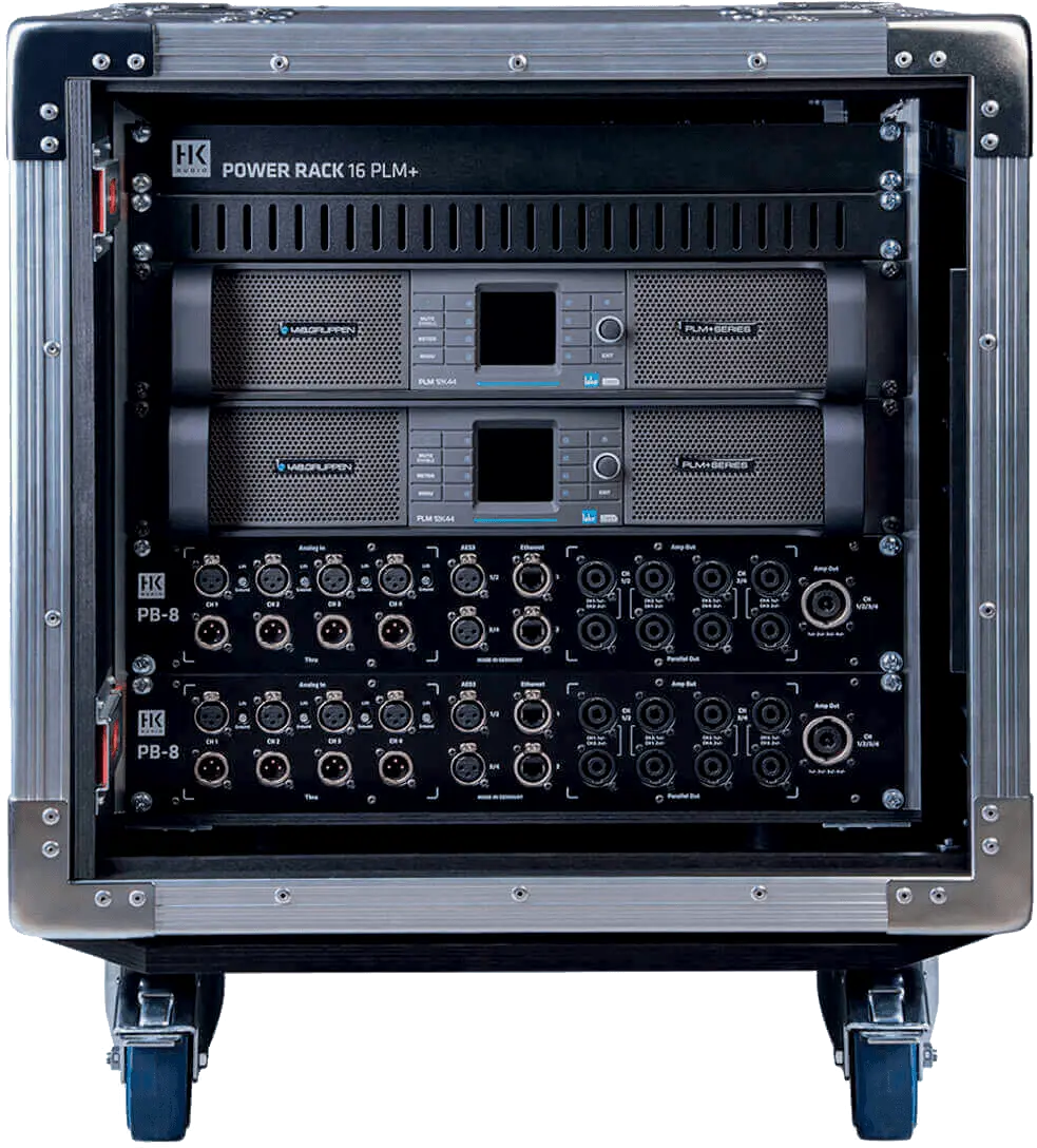 The C-DRIVE 8 LG amp rack is the perfect engine for driving our passive Pro Audio products, like COHEDRA, COHEDRA Compact, CONTOUR Series*, CONTOUR ARRAY*, CONTOUR X, COSMO and LINEAR 5*. Designed to withstand the rigors of the road, this amp rack’s sturdy shock-mount case houses dual PLM 12K44 power amps with built-in Lake processors, and two PB-8 Patchbays. Rugged and reliable, this all-in-one unit packs a powerful punch.