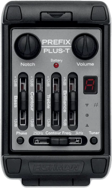 The Prefix Plus-T also offers a Brilliance control, Phase switch and Notch filter to help fight feedback. In addition, the built-in chromatic tuner can be used without plugging in the guitar.