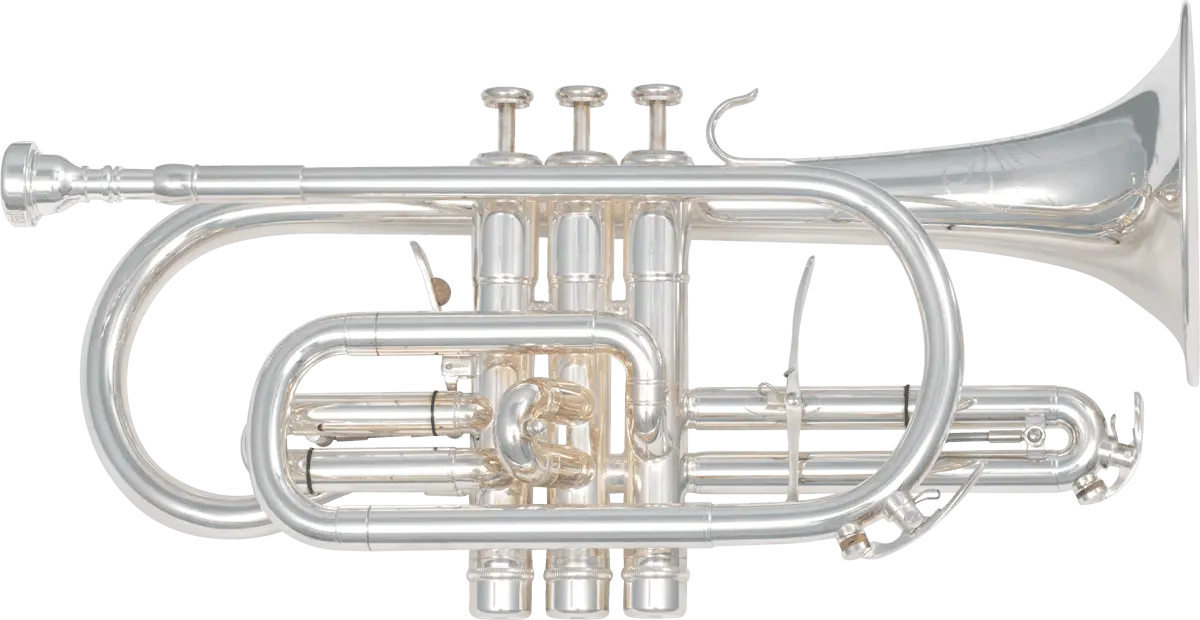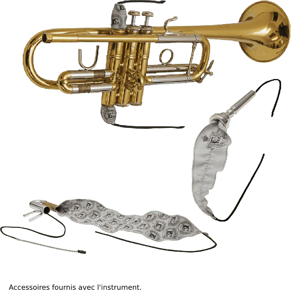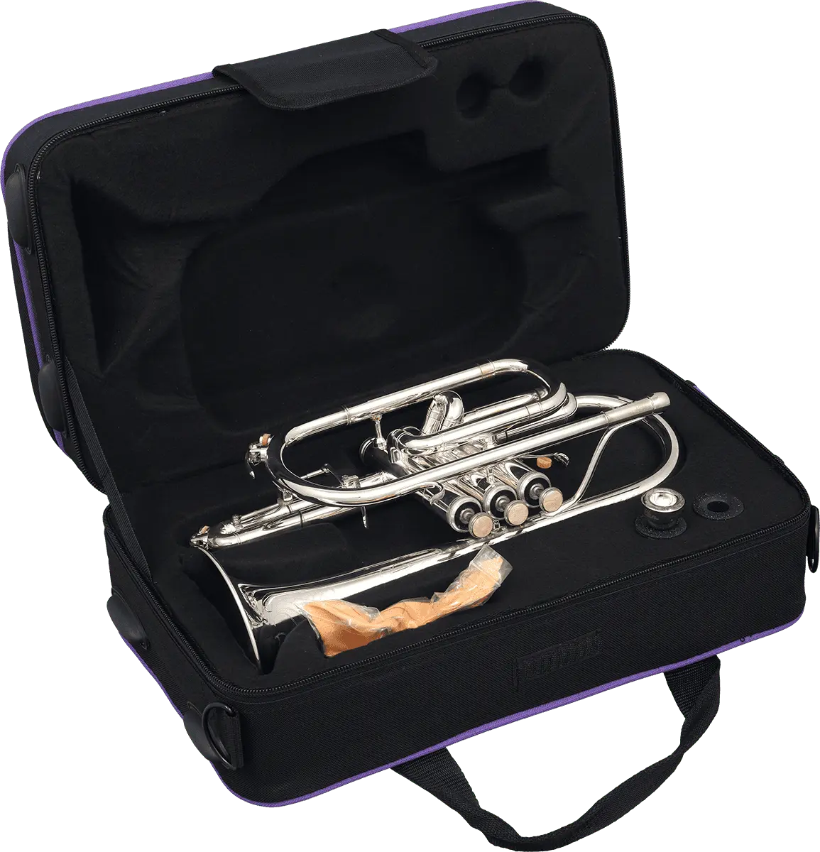 Rose brass leadpipe, medium large bore. Thin bell 125mm diameter, enriched with copper for a soft sound. Beautiful engraving. Metal piston buttons, heavy bottom caps. Triggers on 1st and 2nd valve slides. Deluxe soft case backpack.