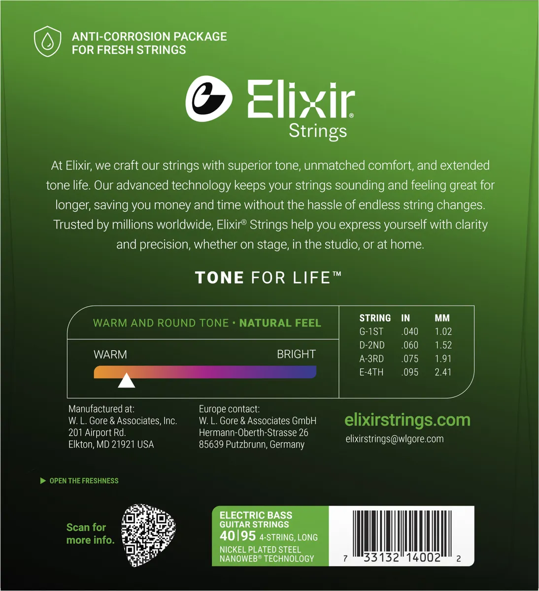 Elixir® Nickel Plated Steel Bass Strings with a NANOWEB® Coating deliver a rich, rounded tone with greater clarity and heavier mid-range presence.