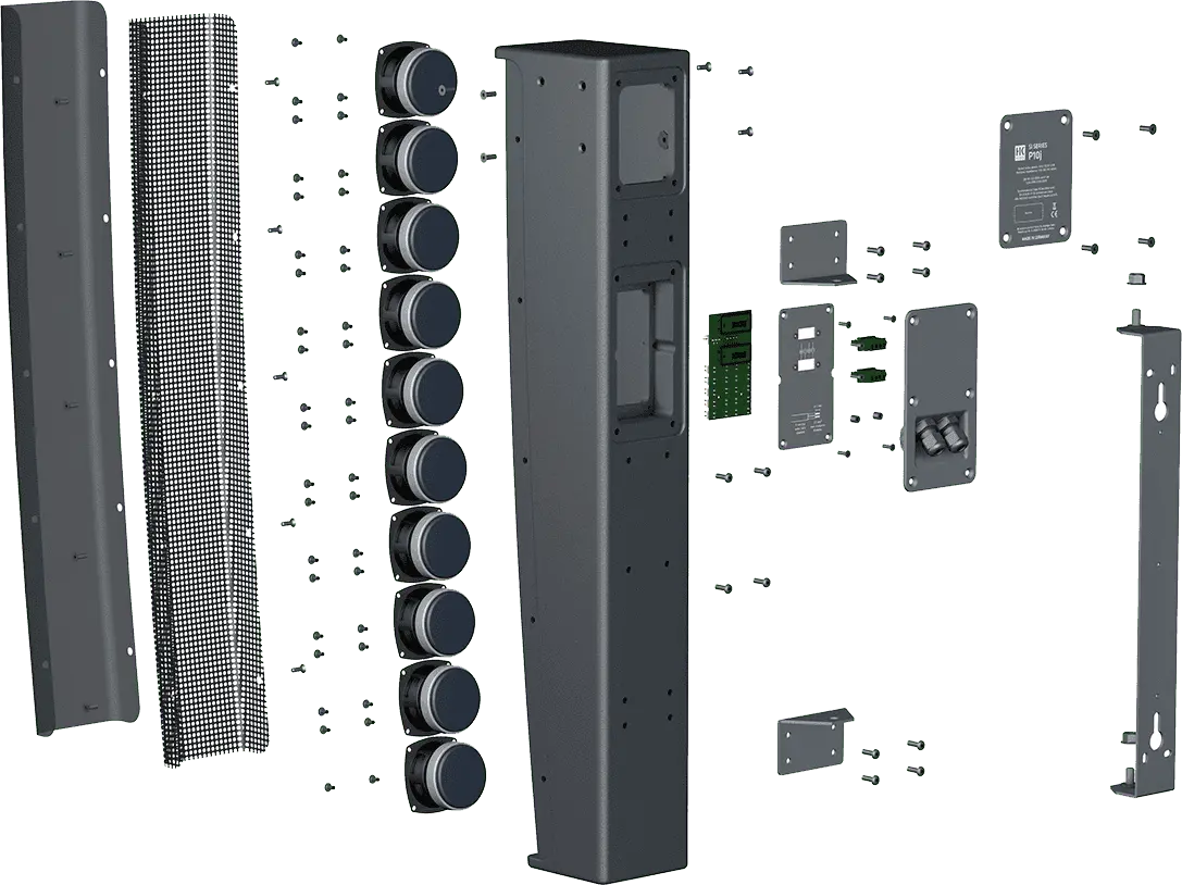 Professional column loudspeaker for installations with a closed cabinet, loaded with 10 x 3“ fullrange drivers with 600 W program power rating. Extensive mounting accessories for outdoor and indoor installations and very high max. sound pressure level for demanding environments. Asymmetrical directivity, combinable with SI SERIES P10i for precise coverage for difficult rooms or for outdoor long-throw applications.