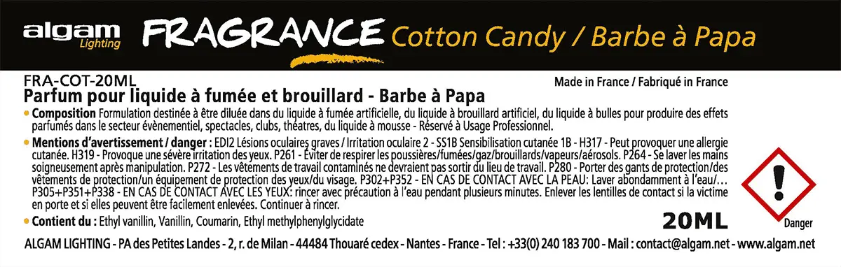 The 20ml bottles of Algam Lighting fragrance can be diluted in 5 to 20 litres of smoke or fog fluid; they offer a wide choice of scents for all your events. Whether for concert halls, sports venues, fashion shows or clubs, smoke and haze fragrances can give the event a specific character. Algam Lighting fluid fragrances follow a strict and controlled manufacturing process in compliance with current regulations.