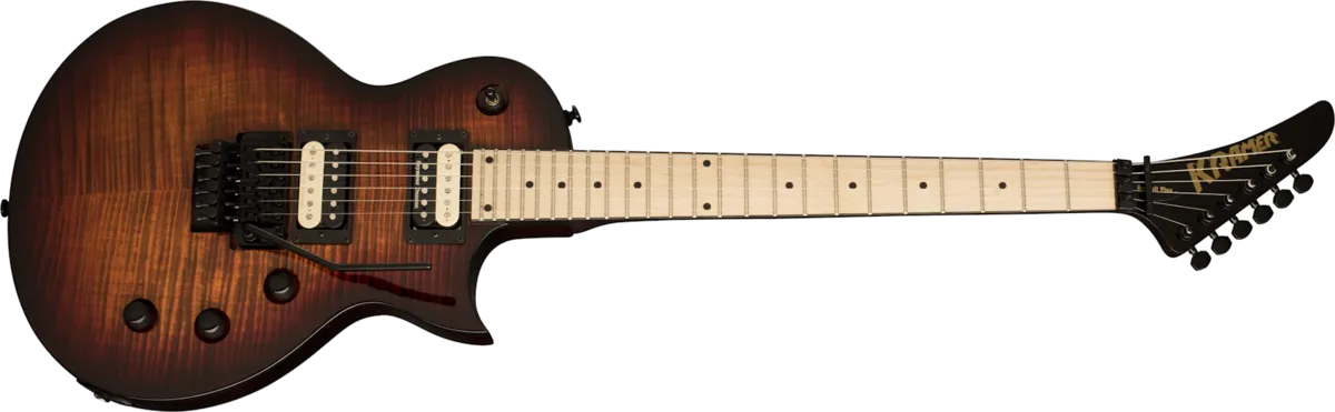 The Assault Plus combines a classic Les Paul™-style body with the speed, power, and reliability of Kramer. Featuring a Mahogany body with a Flame Maple Veneer Top, reverse headstock, Seymour Duncan® JB™ and JN™ “zebra coil” humbuckers, and a Floyd Rose® 1000 Tremolo with R2 Lock Nut.