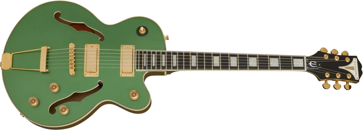 The new UpTown Kat™ ES Collection is the next generation of Epiphone’s classic “Kat” archtop and features a true ES style semi-hollowbody archtop with newly designed Epiphone ProBucker™ FB720 mini humbuckers™, Graph Tech® nut, Ebony fingerboard, and Grover® Rotomatic tuners. Available in Sapphire Blue Metallic, Ruby Red Metallic, Emerald Green Metallic, and Topaz Gold Metallic.