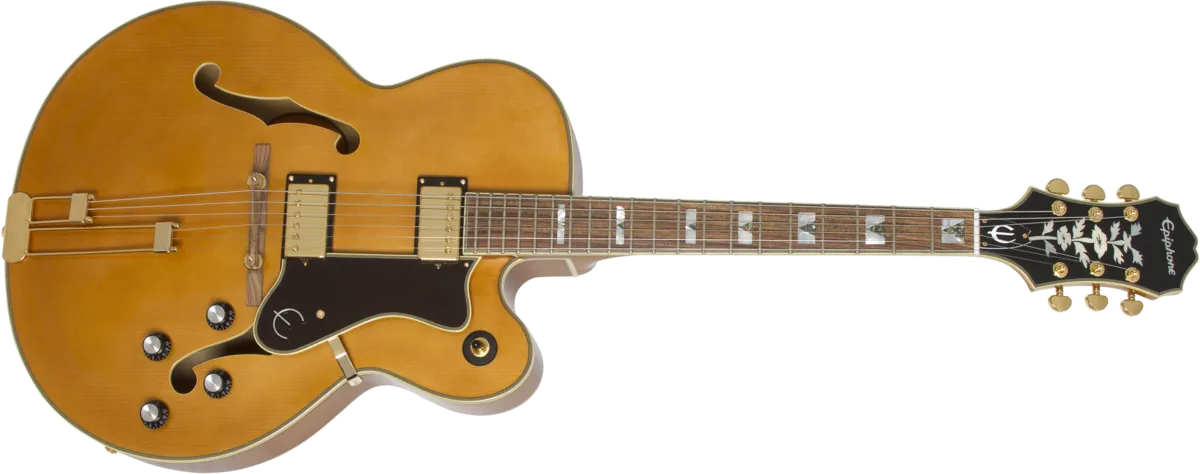 For over 70 years, the classic Epiphone Broadway has been considered the ultimate hollowbody jazz guitar. Now in a beautiful new Vintage Natural Finish with Alnico Classic™ Humbuckers, a vintage styled Frequensator™ Split Trapeze tailpiece, and Grover® Rotomatic™ machine heads.