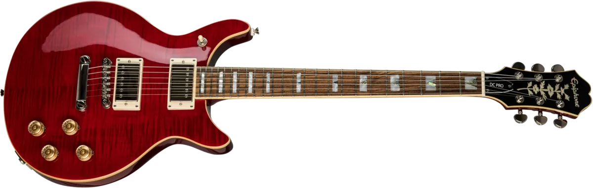 The DC PRO is Epiphone’s modern take on the classic Del Rey Double Cut design. Featuring a solid Mahogany body with a AAA Flame Maple Veneer top, ProBucker™ humbuckers with coil-splitting, and a treble bleed circuit to maintain clarity at reduced volumes. Now available in Black Cherry, Faded Cherry Sunburst, Midnight Ebony, Mojave Fade, and Wild Ivy.
