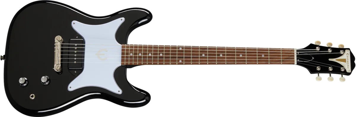 First introduced in 1958, the Epiphone Coronet was one of Epiphone's first and most successful original solid body electric guitar designs. The latest version brings back many of the features of the early Coronet models including the symmetrical double-cutaway mahogany body with a single Epiphone PRO™ P-90 Dogear pickup, three on a side reduced sized Kalamazoo headstock with Epiphone Bikini badge and ivory button tuning machines, and a white butterfly pickguard with foil E logo. The Epiphone Coronet comes equipped with a glued-in mahogany neck with a medium C profile, Indian laurel fretboard with 12" radius and 22 medium jumbo frets, 1 volume and 1 tone control with CTS® potentiometers, and an Epiphone Lightning Bar compensated wraparound bridge.