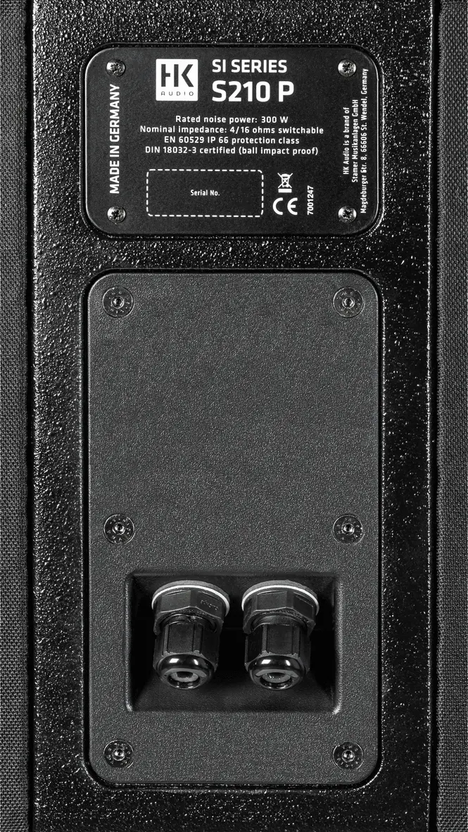 Passive high-performance subwoofer for installations, 600 W (program), switchable impedance (4 ohms or 16 ohms), 2×10″ transducers and 2×10″ passive radiators, 121 dB max. SPL (10 % THD), 48 Hz – 140 Hz (-10 dB), 2x 4-pole connectors, IP 66 rating