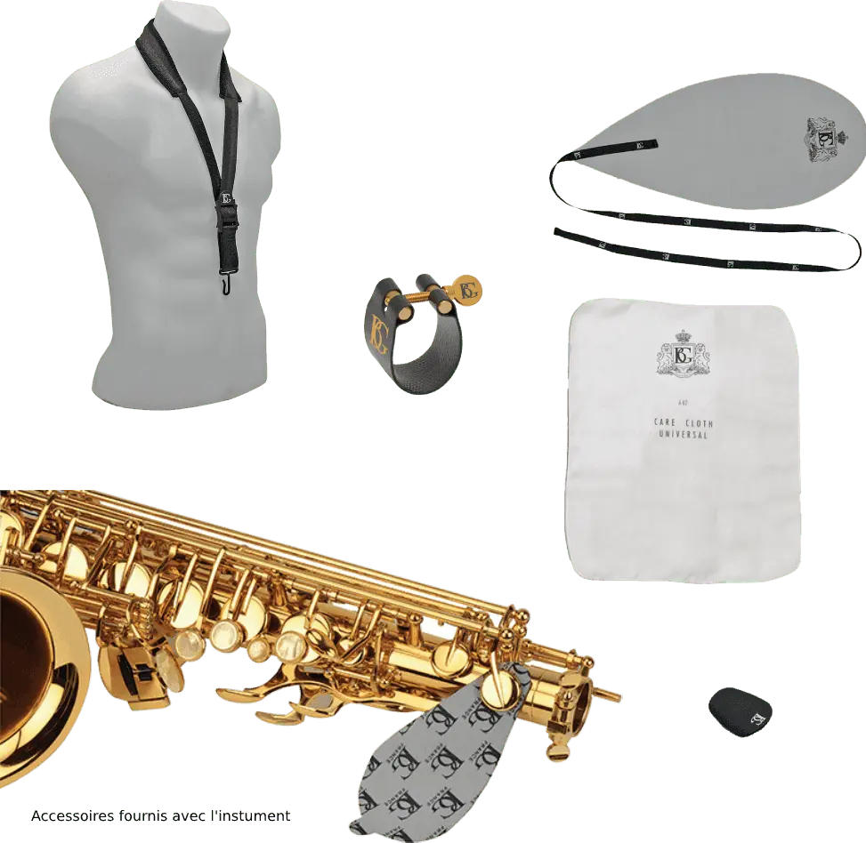 Eb, gold lacquered, engraved bell. 3 points Special SML connecting ring from bell to body. Adjustable screws on low keys.