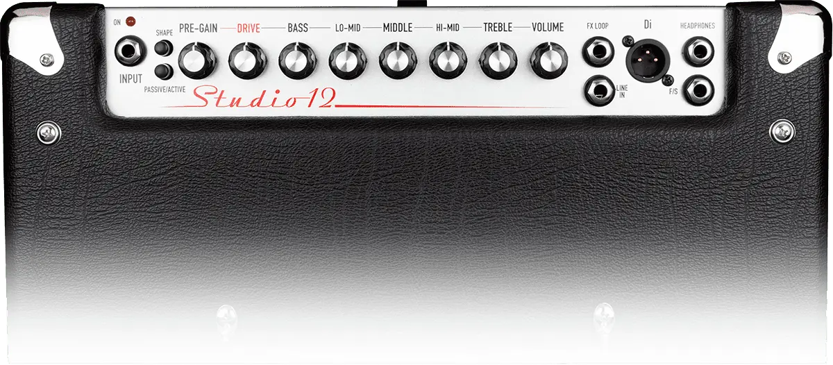 The incredibly stylish Studio 12 delivers 120 watts of premium Ashdown tone through a Custom designed lightweight 12" speaker. Potent yet portable the Studio 12 comes bursting with great features including built in valve emulated overdrive, headphone out, 5 band EQ, Line In and more.
