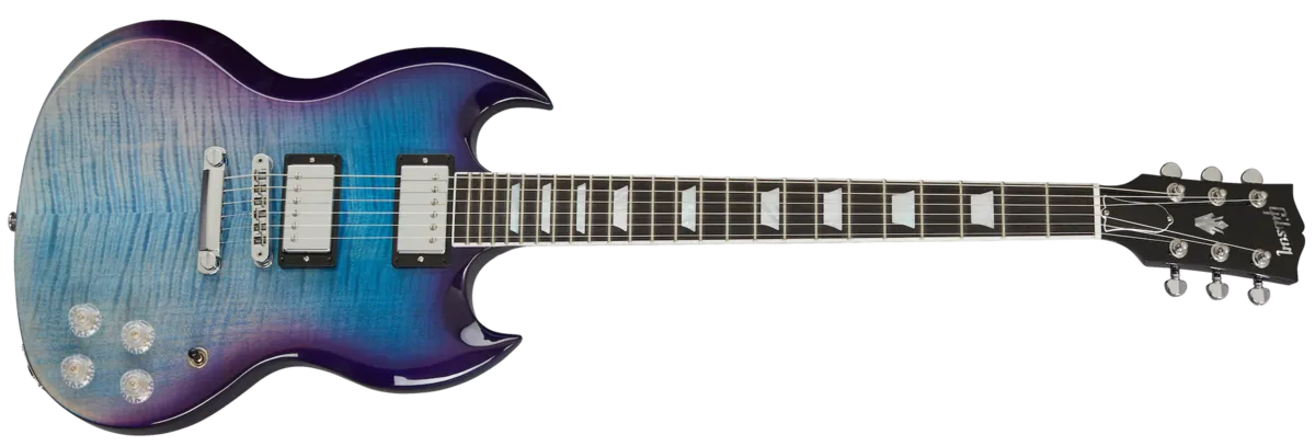The newly refreshed Gibson SG Modern incorporates many contemporary updates that players have embraced, and it’s much more than a classic “solid guitar;” it’s a hybrid between an SG™ and a Les Paul™. Shaped and scarfed like a classic SG, the body is crafted with a AA maple top and mahogany back, characteristic of a Les Paul. This combination is renowned for its resonance and sustain. The genuine ebony, 24-fret compound radius fingerboard and asymmetrical, SlimTaper™ neck allow fast and silky access to the highest frets. A pair of calibrated Burstbucker™ Pro Alnico 5 humbuckers deliver firepower, and the push-pull controls allow you to switch between the Gibson humbucker and the single coil P-90 sounds, both of which have defined so many genres of music across multiple generations since we invented them. Upscale appointments include genuine mother-of-pearl inlays, Grover® Rotomatic® tuners, and clear Top Hat knobs.