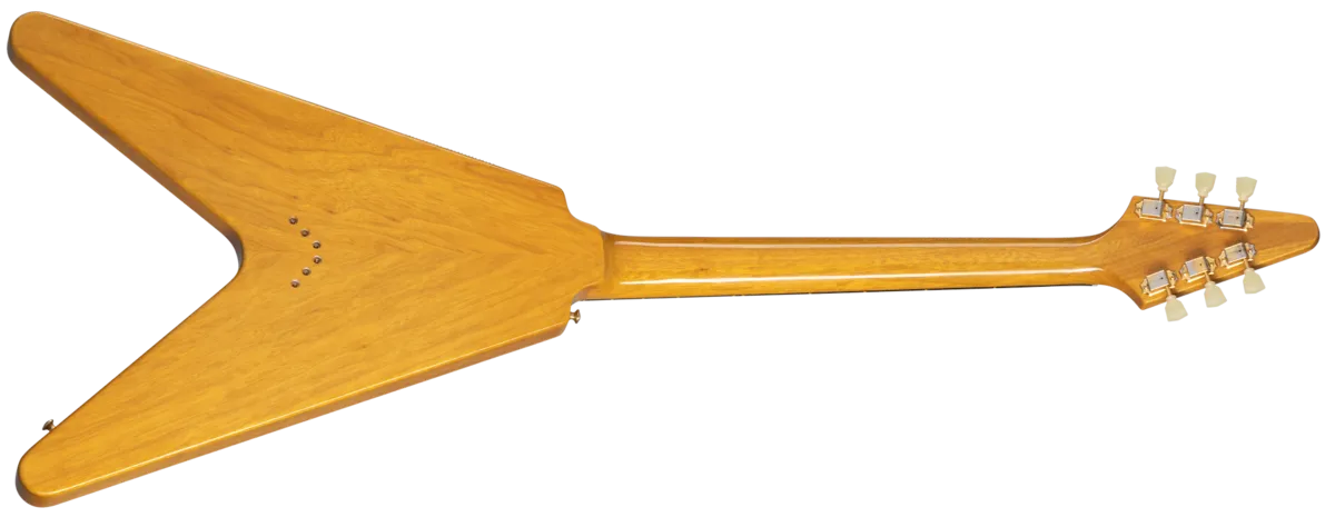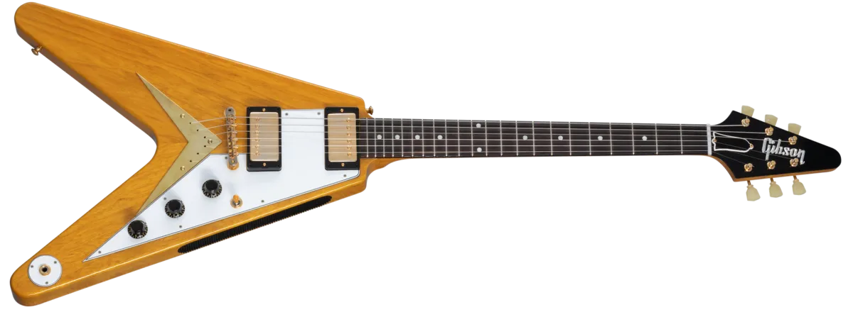 The Gibson Flying V™ was way ahead of its time when it was introduced in 1958, and only 81 were shipped that year, but it has become very popular in the years since then. The classic vintage Flying V features have been carefully recreated in this Historic Reissue model. Featuring an ABR-1 bridge with a string-through korina body, Custombucker pickups, korina neck, Indian rosewood fretboard, two volume and one tone control with CTS® pots and a phone book capacitor, gold hardware, Kluson® tuners, and a 4-ply pickguard. A historically accurate case is included, with a classic brown exterior and plush pink interior.