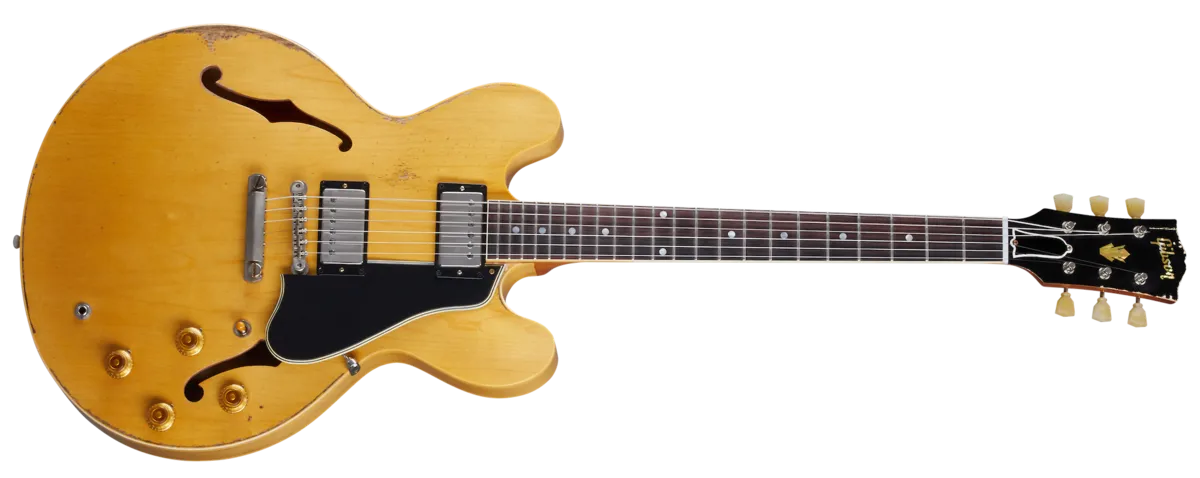 The Historic Reissue ES-335 is back and better than ever thanks to a year of studying, scanning, and listening to original examples. The expert craftspeople at the Gibson Custom Shop have rendered every contour, profile, inlay and color of the priceless vintage ES™ models in magnificent detail. The result is a playing and ownership experience that will keep you coming back for more. This 1959 Reissue model features rounded cutaways, a Medium C-shape neck profile scanned from originals, dot inlays, Kluson® tuners, and vintage-replica parts. It also features Ultra Heavy Aging by the skilled artisans of the Murphy Lab. The Murphy Lab Ultra Heavy Aged finish treatment, paired with heavily aged hardware, simulates decades of heavy play wear, giving it the unique character, vibe, and feel of an original example from the Gibson Golden Era.