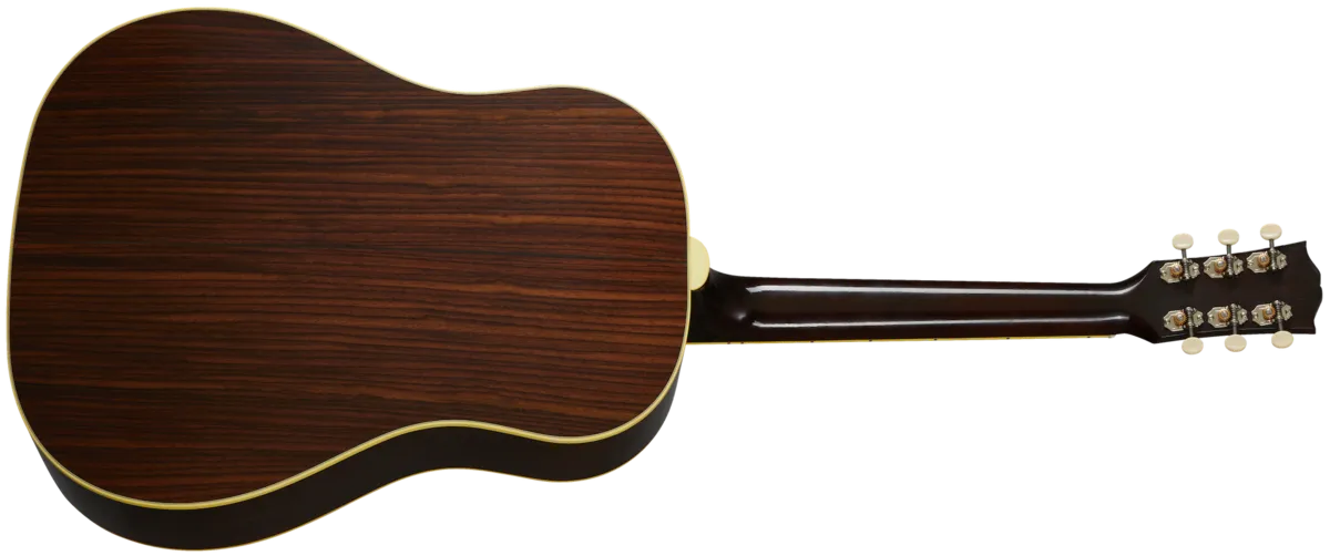 The Custom Shop Historic Reissue 1942 Banner Southern Jumbo features the vibe of a vintage Gibson Acoustic. The thermally aged Adirondack red spruce top and rosewood back and sides have outstanding tonal response and superior playability. At home playing first position chords or picking lead blues licks, the Southern Jumbo is a versatile instrument. Proudly displaying the "Only a Gibson is Good Enough" banner on the headstock, this custom instrument also includes an open slot bridge, a bone saddle and nut, and the classic 1.77" nut width.