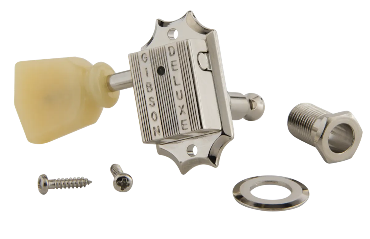 Gibson’s vintage machine heads with pearloid buttons feature solid Nickel, closed housing construction, period-correct vintage styling, and traditional pearloid buttons that deliver precise tuning, while adding a luxurious, classic feel to your guitar’s headstock. This OEM part comes in a Nickel finish. 14:1 Tuning Ratio. Special note: These tuners feature screw in bushings, which require a larger diameter mounting hole than traditional ‘push in’ bushing tuners.