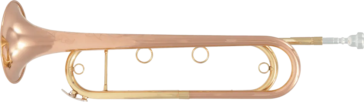 The soloist’s instrument! Two finger rings held similar to the piston trumpet. The sound is rich and has incredible projection. The 13 fundamental notes have perfect precision, high register sound easily. Reversed leadpipe. 2 waterkeys.