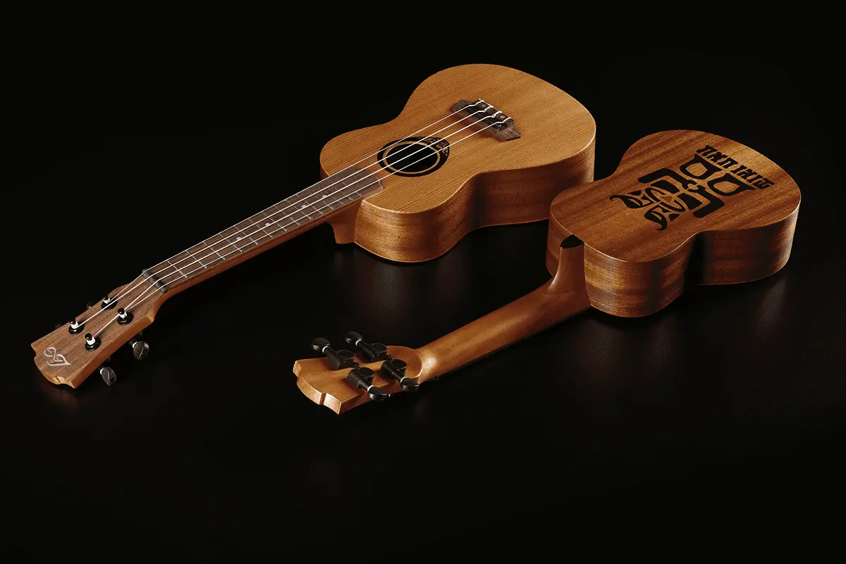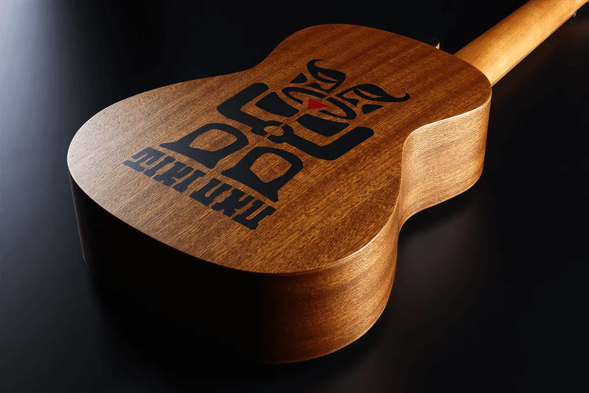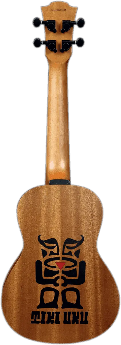 The walnut fingerboard and bridge combine durability with a smooth touch. The graphite nut and saddle guarantee precise intonation, while the die-cast tuners ensure long-lasting stability. The satin finish underlines the natural character of the woods, while the engraved Tiki Uku logo on the arched back adds identity and charm.