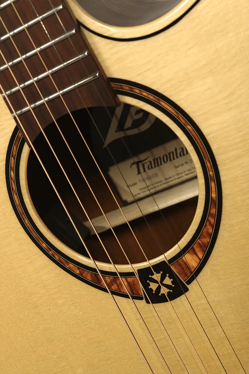 The T318ACE is built with a solid top of AA Engelmann spruce, meticulously hand-selected by Lâg luthiers. The back and sides are made of visually stunning Flamed Ovangkol wood, giving the instrument both a pleasing aesthetic and enhanced sonic characteristics. The guitar's glossy finish further elevates its appearance.