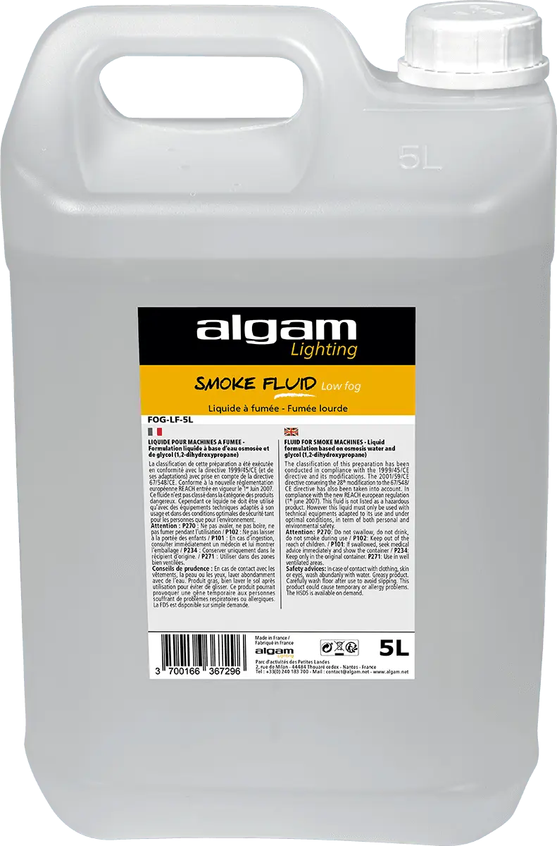 Low fog creates a compact, ground-level smoke with excellent stability and slow dissipation. Algam Lighting fluids are manufactured in France according to an extremely strict process, in conformity with all the legal standards necessary for this type of products. Reliable and efficient, Algam Lighting fluids are compatible with most machines on the market.
