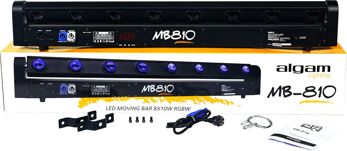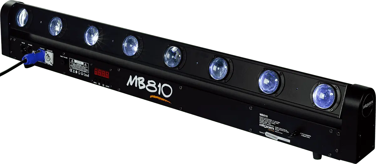 The Algam Lighting MB810 motorized bar is armed with 8 RGBW LEDs of 10W each, generating light beams of remarkable intensity with a tight 2.5° angle. This combination guarantees optimum lighting area coverage and striking visual effects on any private performance, in the background of a TV set, and even in the largest environments such as a stage.