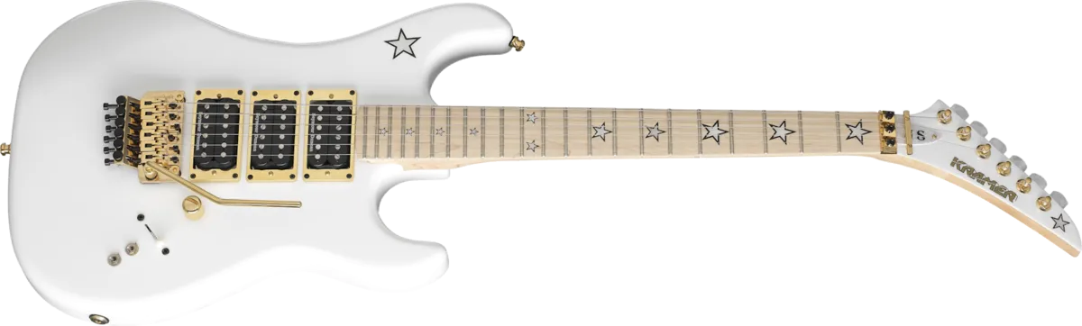 The 1980s classic Kramer Jersey Star returns with the iconic Mother-of-Pearl Jersey Star logo, gold hardware, Seymour Duncan® JN™ and JB™ Humbuckers, and a Floyd Rose® 1000 Series Tremolo and R2 Lock Nut.