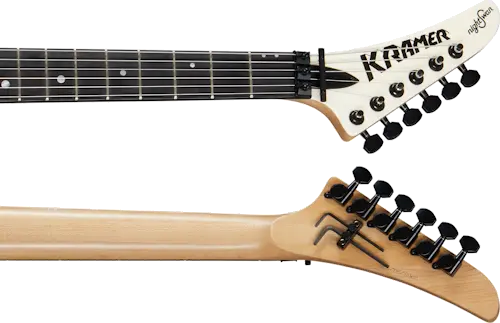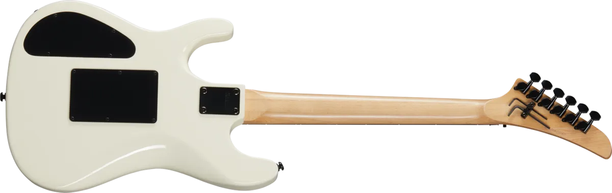 The legendary shred sled from the late 80s returns to the Kramer lineup. Featuring a double-cutaway mahogany body with a deep cut lower horn for exceptional upper-fret access, the NightSwan™ is propelled by two Seymour Duncan® JB™ humbucking pickups and is ready for deep swoops and dives with its Floyd Rose® 1000 Series tremolo and R2 locking nut. The ebony fingerboard has a 16" radius and features 24 jumbo frets and "ping pong" pearloid dot inlays, while the back of the slim, C-shaped 3-piece hard maple neck is satin-finished, which makes it perfect for lightning-fast licks. This 'Swan is finished in Vintage White with the rare and highly desirable Aztec Graphics.