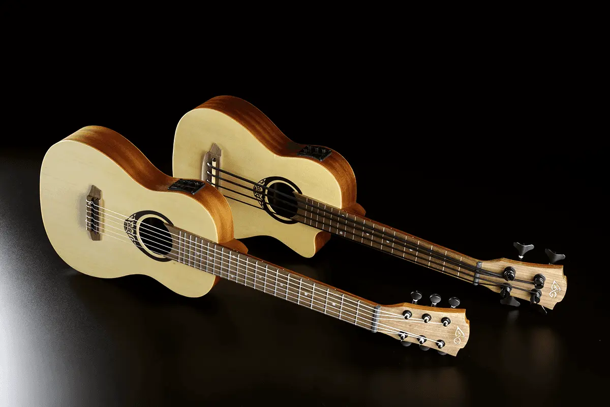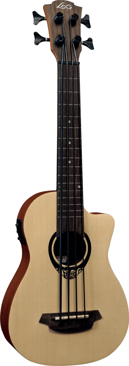 A “double bass” version of the ukulele, complete with a solid spruce top and Indonesian rosewood fingerboard. The fretless Mini Bass Tiki Uku also features a preamp with a 3-band EQ and tuner. Achieve the sound of an acoustic bass with an instrument that’s smaller and easier to play.