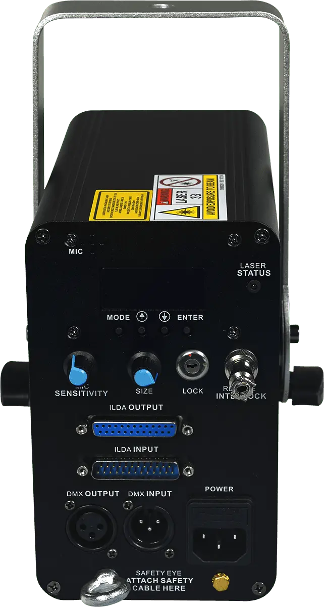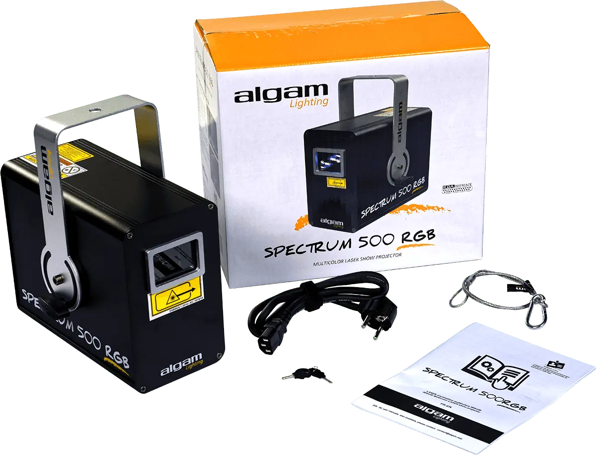 The Spectrum 400 RGB proudly features a total power of 400mW distributed over 3 motorised lasers ensuring surprisingly effective effects for this category. Ideal for DJs or mobile discos, the Spectrum 400 RGB, thanks to its 3 laser light sources (1 red, 1 green and 1 blue), allows multiple effects to animate the dance floor during weddings, private parties… Easy to use, offering no less than 128 internal programmes (tunnel effects, waves, geometric patterns, graphics, etc.) for automatic or music-controlled operation, the Spectrum 400 RGB is fully DMX controllable on 11 channels for precise control of the laser effects and their rotation speed, and for remote supervision of the many options available to create a multitude of stunning effects.