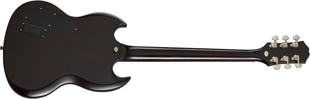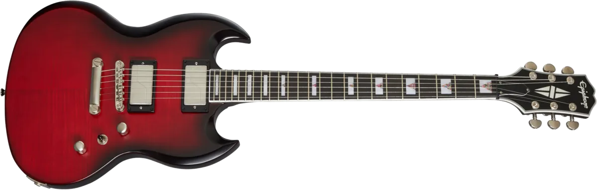 The Epiphone Prophecy SG brings high-performance features to the classic SG™ design, making it an excellent choice for today's progressive guitarists. The mahogany body is topped with a 1/2" maple cap and beautiful AAA flame maple veneer, along with a thinner Aged Vintage Gloss finish. The SlimTaper™ asymmetrical mahogany neck features a 24 fret ebony fingerboard with jumbo frets, Block and Triangle pearloid/abalone inlays with abalone selected to complement the body color, brushed nickel Grover® Locking Rotomatic® tuners, and a black Graph Tech® NuBone® nut. The Epiphone Prophecy SG comes with brushed nickel hardware and is equipped with a pair of proprietary Fishman Fluence® pickups with three voicing options that are selected with the push/pull master volume and tone controls - high gain, modern active high-output humbucker™ with both controls pushed in, classic Patent Applied For-style humbucker when the tone control is pulled out, and shimmering, optimized single-coil tones when the volume control is pulled out.