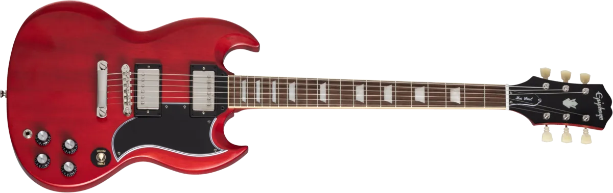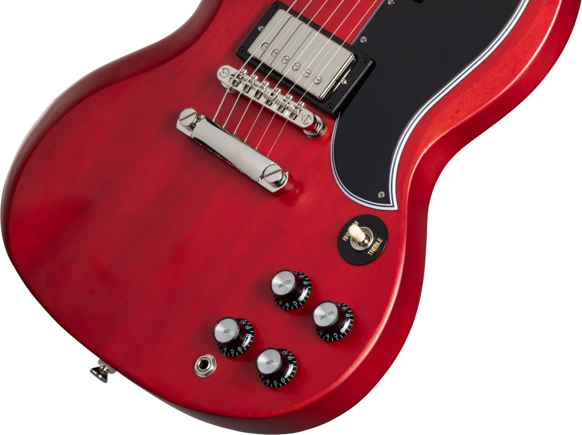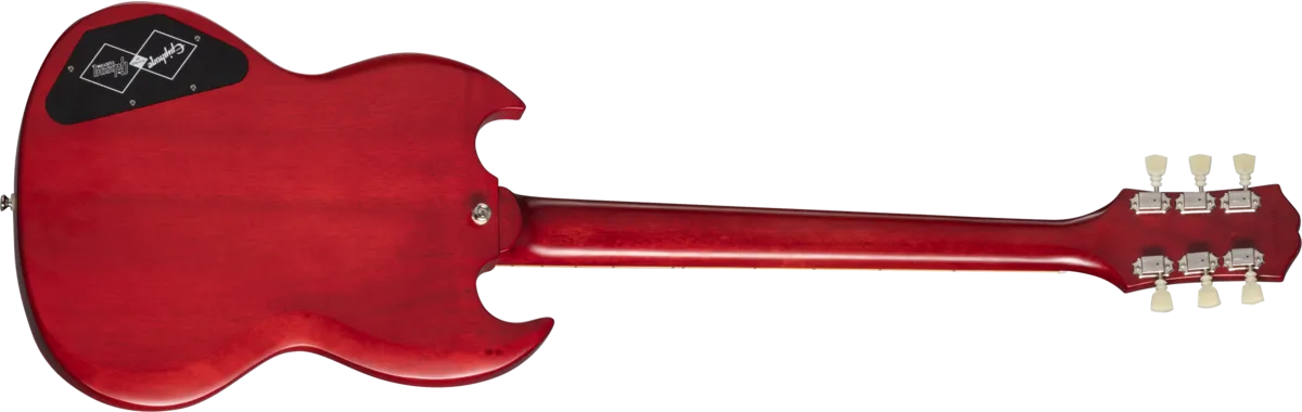 Made in partnership with the Gibson Custom Shop, this Inspired by Gibson™ model is Epiphone’s impressive recreation of one of the most important and popular guitar designs of all time. The Epiphone 1961 Les Paul™ SG™ Standard pays tribute to the legendary original - the very first SG. In 1961, the original shape of the Les Paul model went on hiatus, replaced by an all-new design that is known today as the SG or “solid guitar.” Featuring a two-piece solid mahogany, double-cutaway body with Custom Shop Historic bevels, it also has the one-piece mahogany, fast-playing SlimTaper™ C-shaped neck profile of those legendary early Les Paul SG models. It also has a historically inspired long pickguard and comes equipped with a pair of Gibson™ BurstBucker™ humbucking pickups wired to CTS® potentiometers and Mallory™ capacitors, a Graph Tech® nut, and Switchcraft® output jack and toggle switch. The Epiphone Deluxe tuners feature a historically inspired double ring design. It is available in Aged Sixties Cherry and Aged Classic White. Of course, all of the legendary SG styling and cosmetic touches are here too, and a vintage-style hardshell case is also included.
