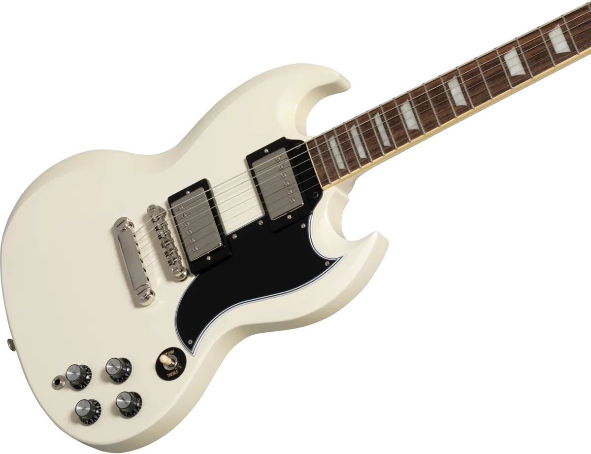 Made in partnership with the Gibson Custom Shop, this Inspired by Gibson™ model is Epiphone’s impressive recreation of one of the most important and popular guitar designs of all time. The Epiphone 1961 Les Paul™ SG™ Standard pays tribute to the legendary original - the very first SG. In 1961, the original shape of the Les Paul model went on hiatus, replaced by an all-new design that is known today as the SG or “solid guitar.” Featuring a two-piece solid mahogany, double-cutaway body with Custom Shop Historic bevels, it also has the one-piece mahogany, fast-playing SlimTaper™ C-shaped neck profile of those legendary early Les Paul SG models. It also has a historically inspired long pickguard and comes equipped with a pair of Gibson™ BurstBucker™ humbucking pickups wired to CTS® potentiometers and Mallory™ capacitors, a Graph Tech® nut, and Switchcraft® output jack and toggle switch. The Epiphone Deluxe tuners feature a historically inspired double ring design. It is available in Aged Sixties Cherry and Aged Classic White. Of course, all of the legendary SG styling and cosmetic touches are here too, and a vintage-style hardshell case is also included.
